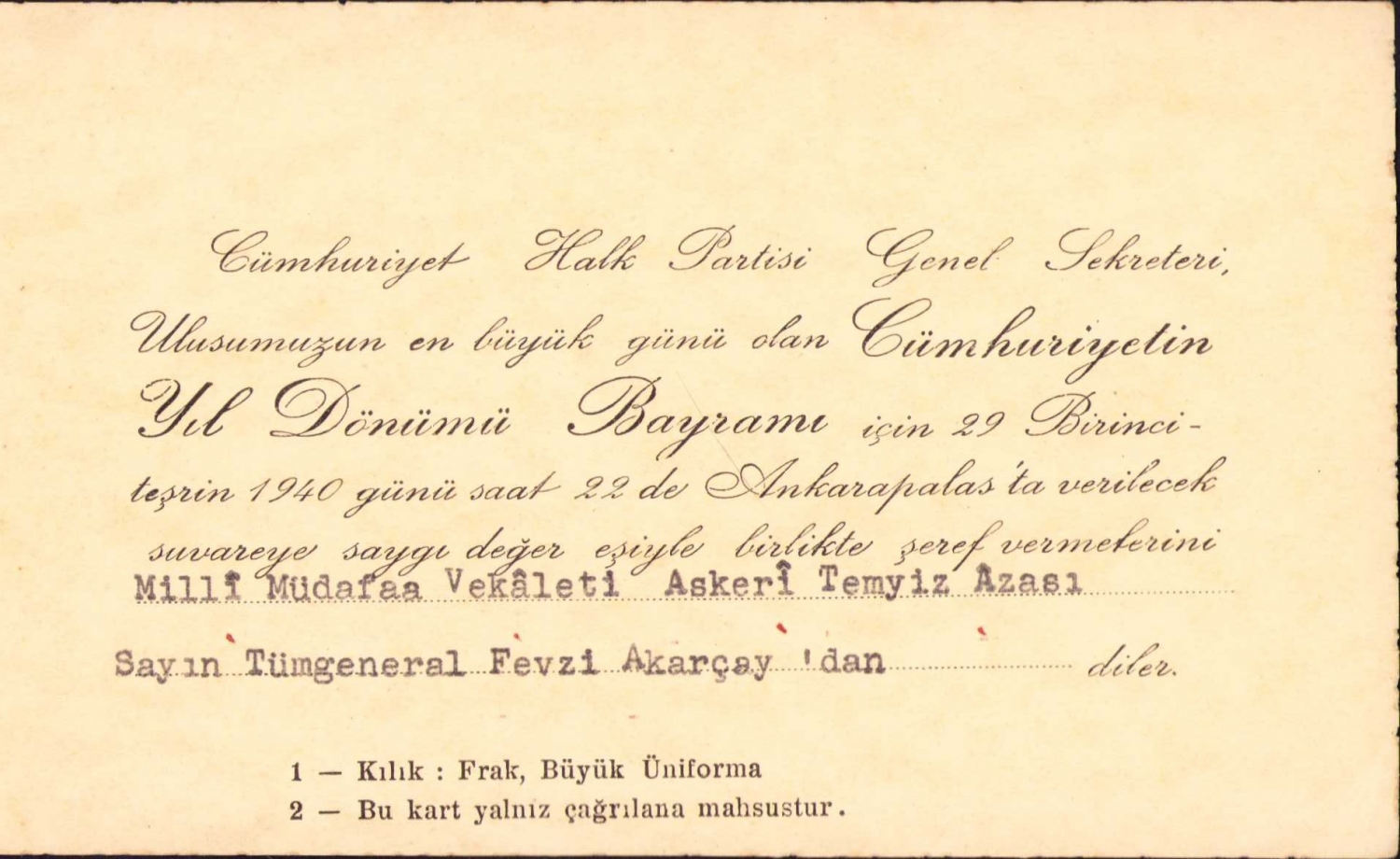 Cumhuriyet Halk Fırkası 1940 Cumhuriyet Bayramı davetiyesi, 16x10 cm