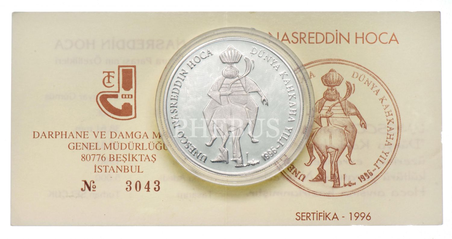 1996 Unesco Nasreddin Hoca Dünya Kahkaha Yılı 750.000 Lira (23,33gr 925 ayar, proof gümüş) TR#H180