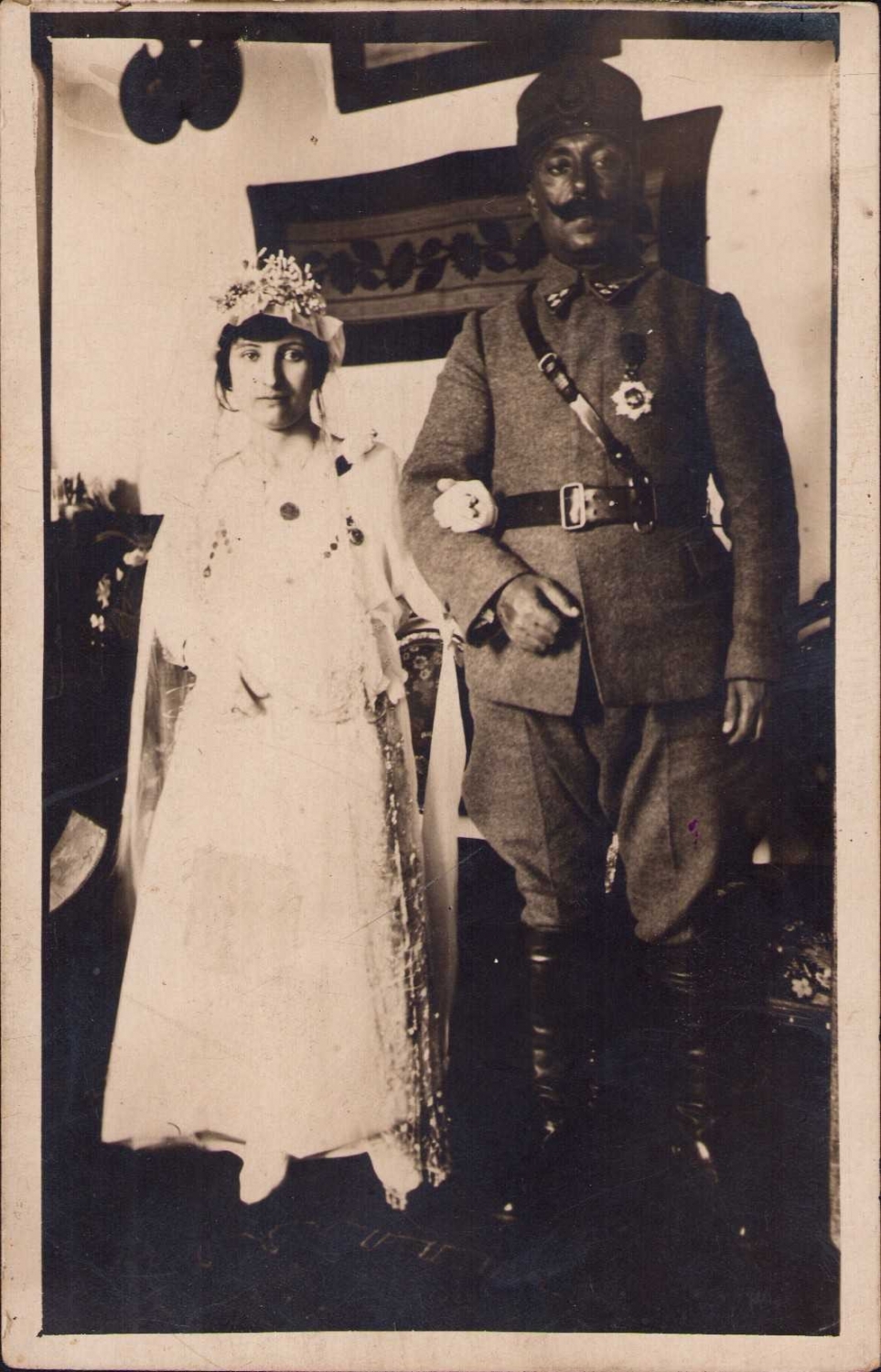 Kalpaklı madalyalı Osmanlı subayı ve gelini, Georges Sargologo, Sirkeci