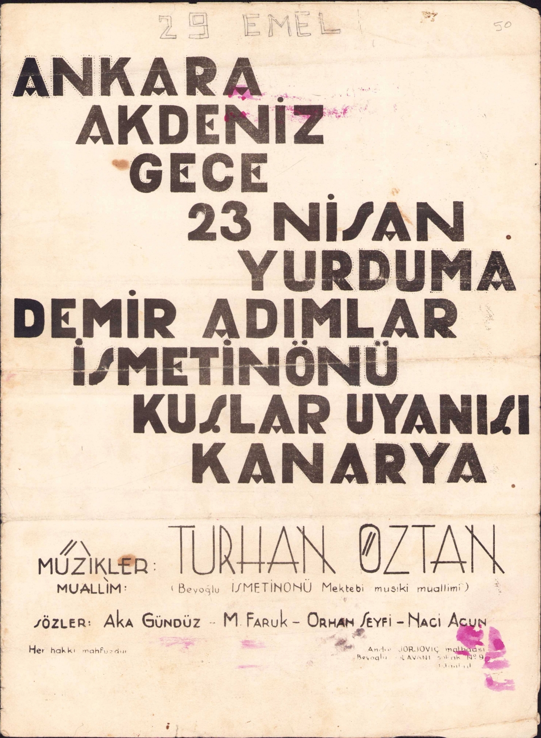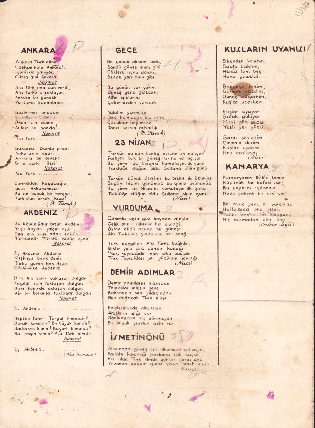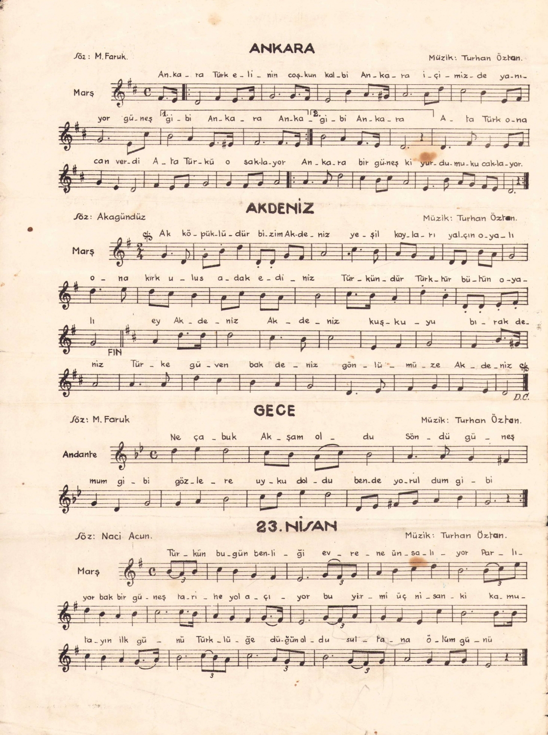 Turhan Öztan'a ait Ankara, Akdeniz, Gece, 23 Nisan, Yurduma, Demir Adımlar, İsmet İnönü, Kuşların Uyanışı, Kanarya şarkıları ve notalarından oluşan kitapçık, haliyle, 20x28 cm