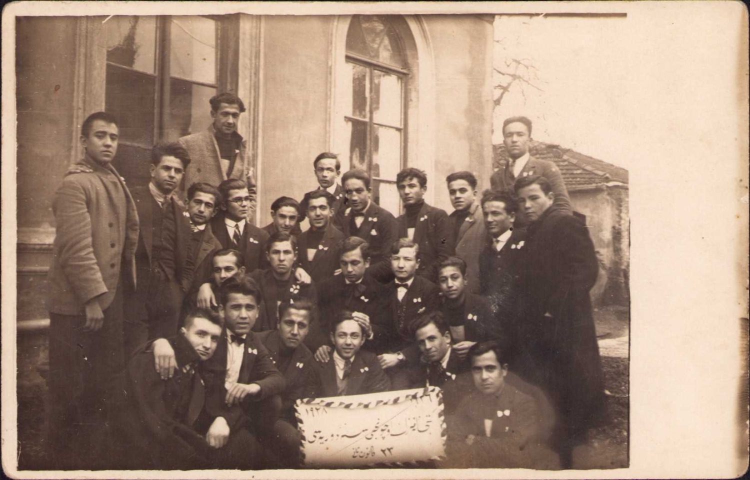 "1928 tarihli Mektebimiz de üçüncü sene-i devriyesi" pankart önünde hatıra fotoğrafı