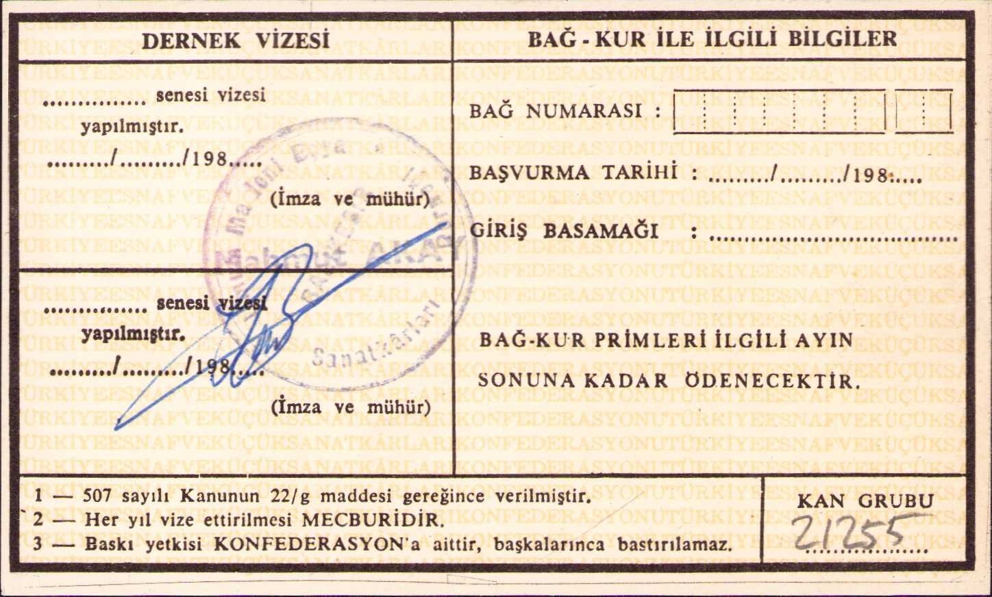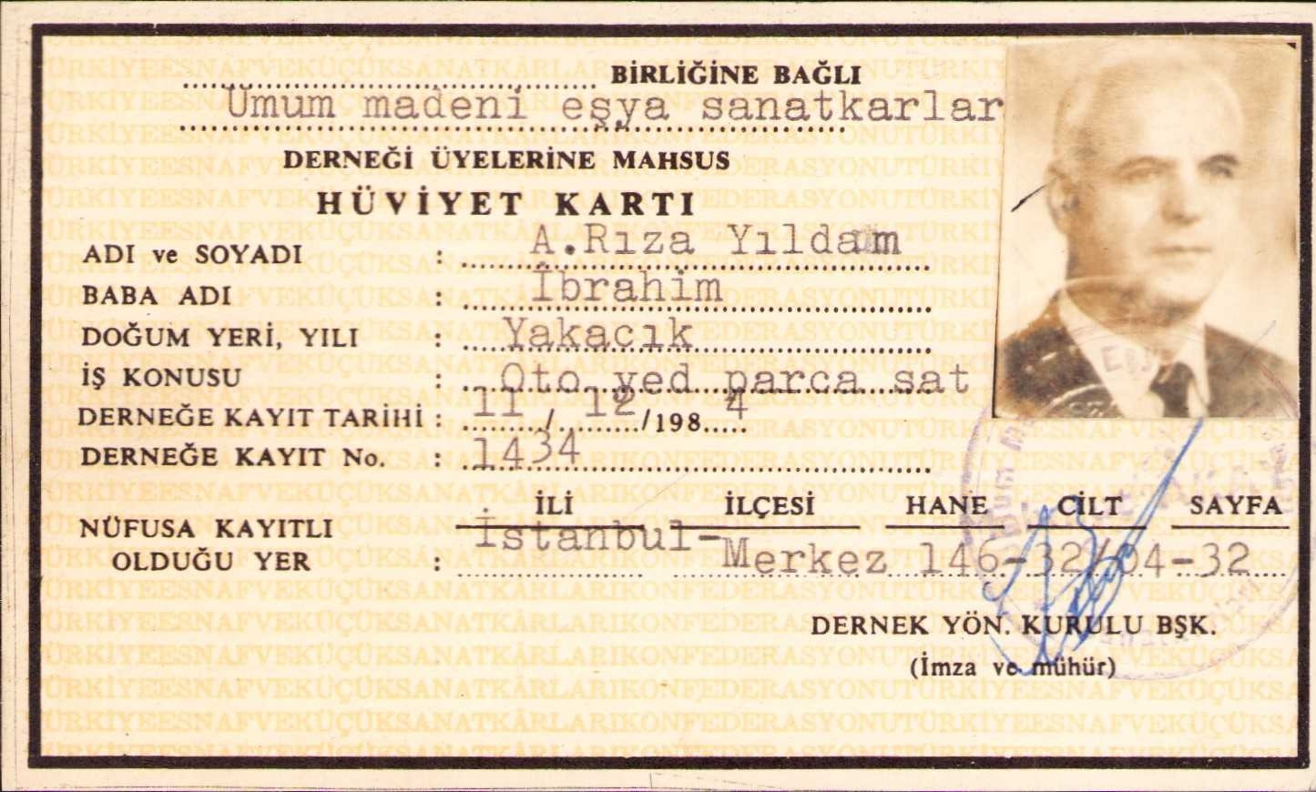 Umum madeni eşya sanatkarlar derneğine mahsus hüviyet kartı, 1984, 12x7 cm