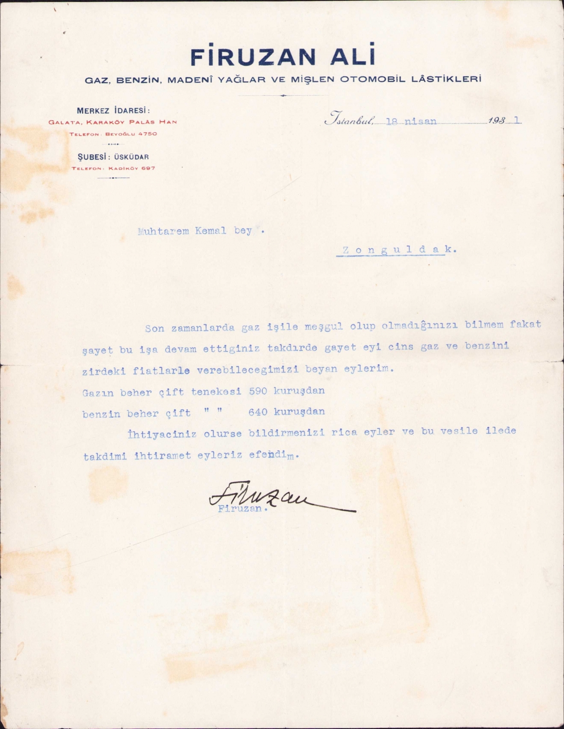 Firuzan Ali gaz, benzin, madeni yağlar ve mişlen otomobil yastıkları antetli evrak, Firuzan ıslak imzalı, 21x28 cm