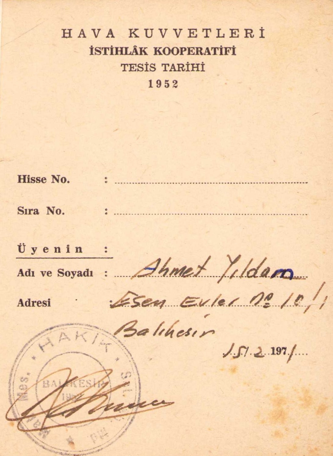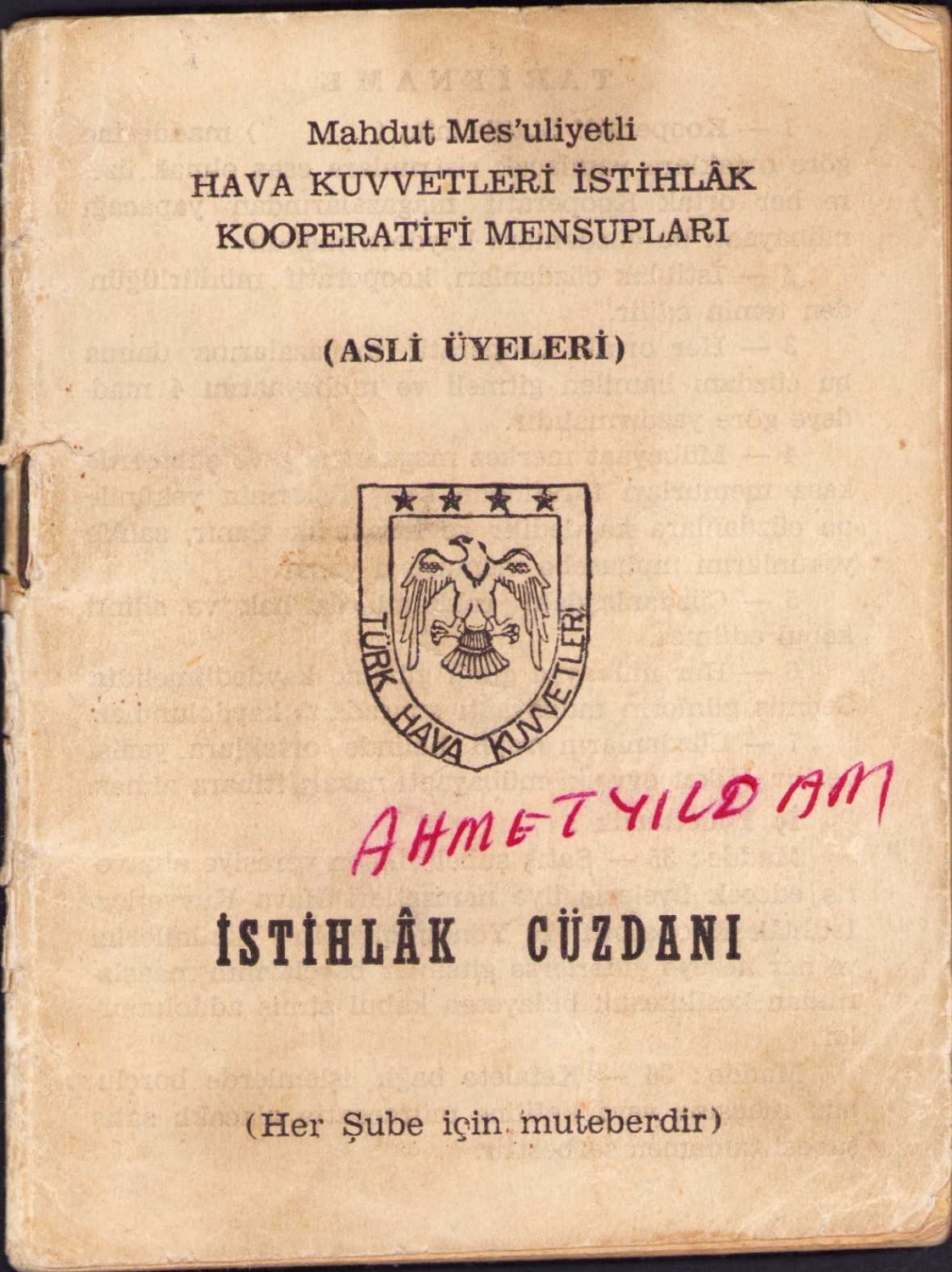 Hava Kuvvetleri İstihlak Kooperatifi Mensupları İstihlak Cüzdanı, Ahmet Yıldam, Balıkesir 1971, 10x13 cm