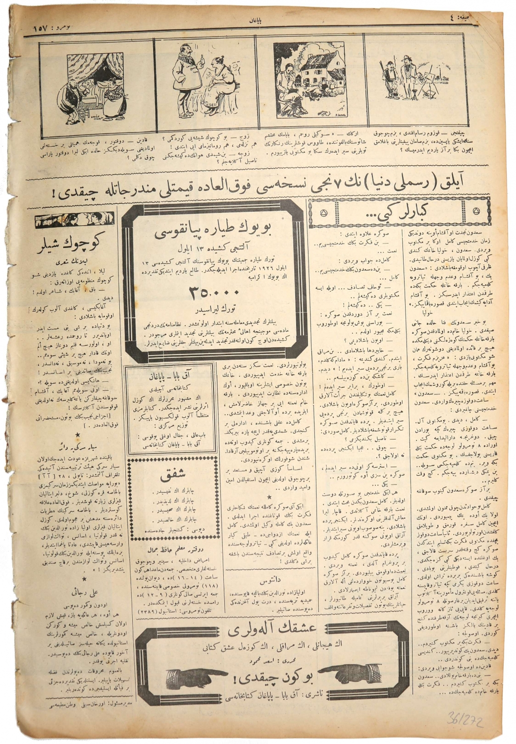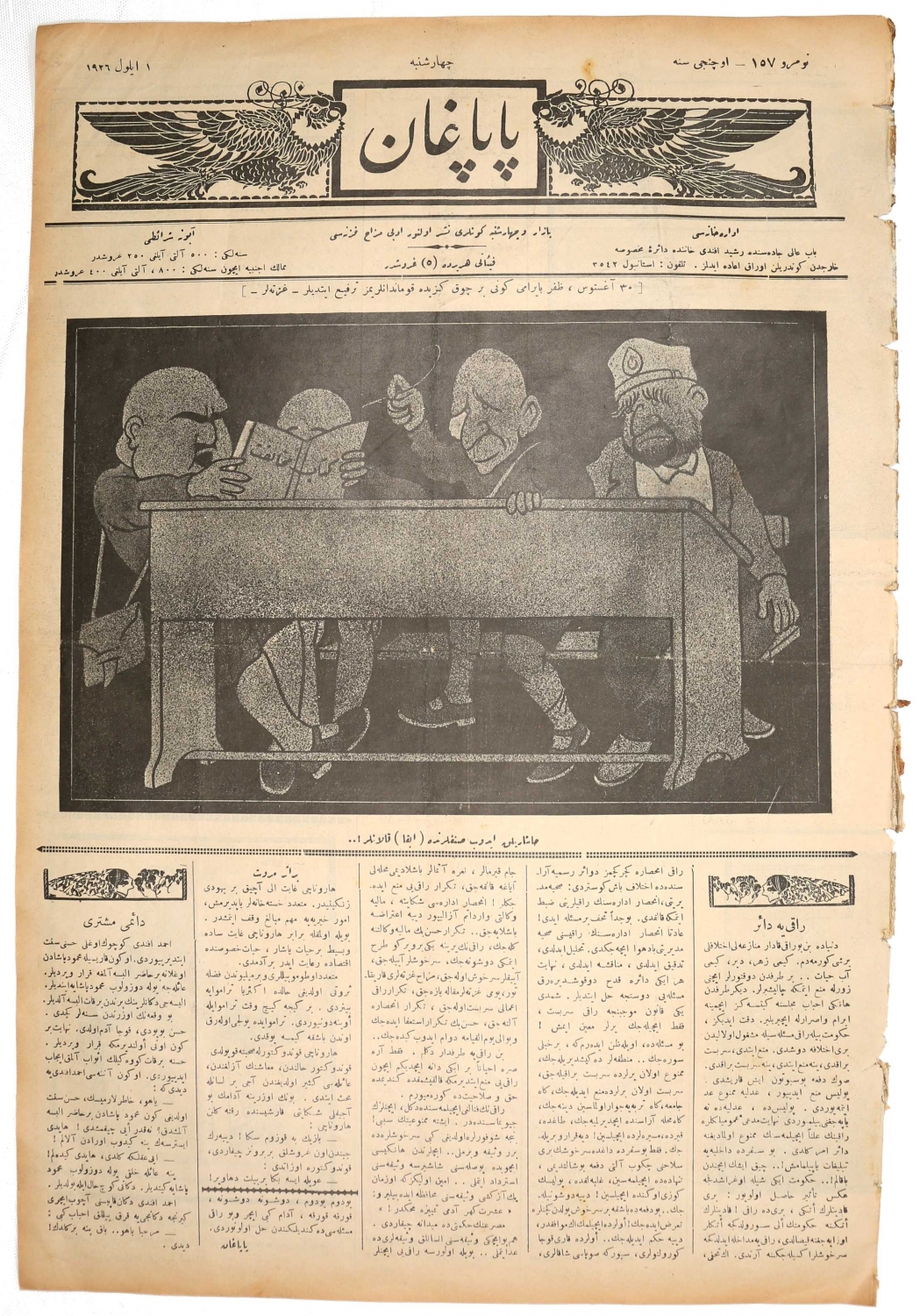 Osmanlıca Papağan mizah gazetesi, 1926, kapak "Haşerelik edip sınıflarında kalanlar!.." 4 sayfa, 30x45 cm