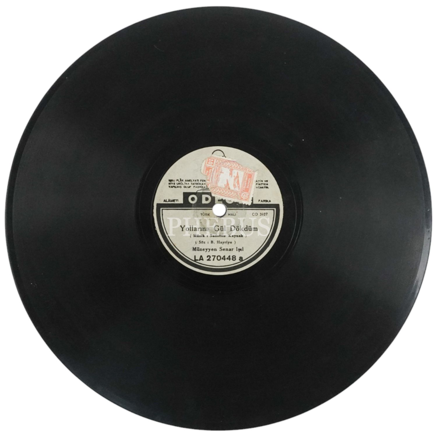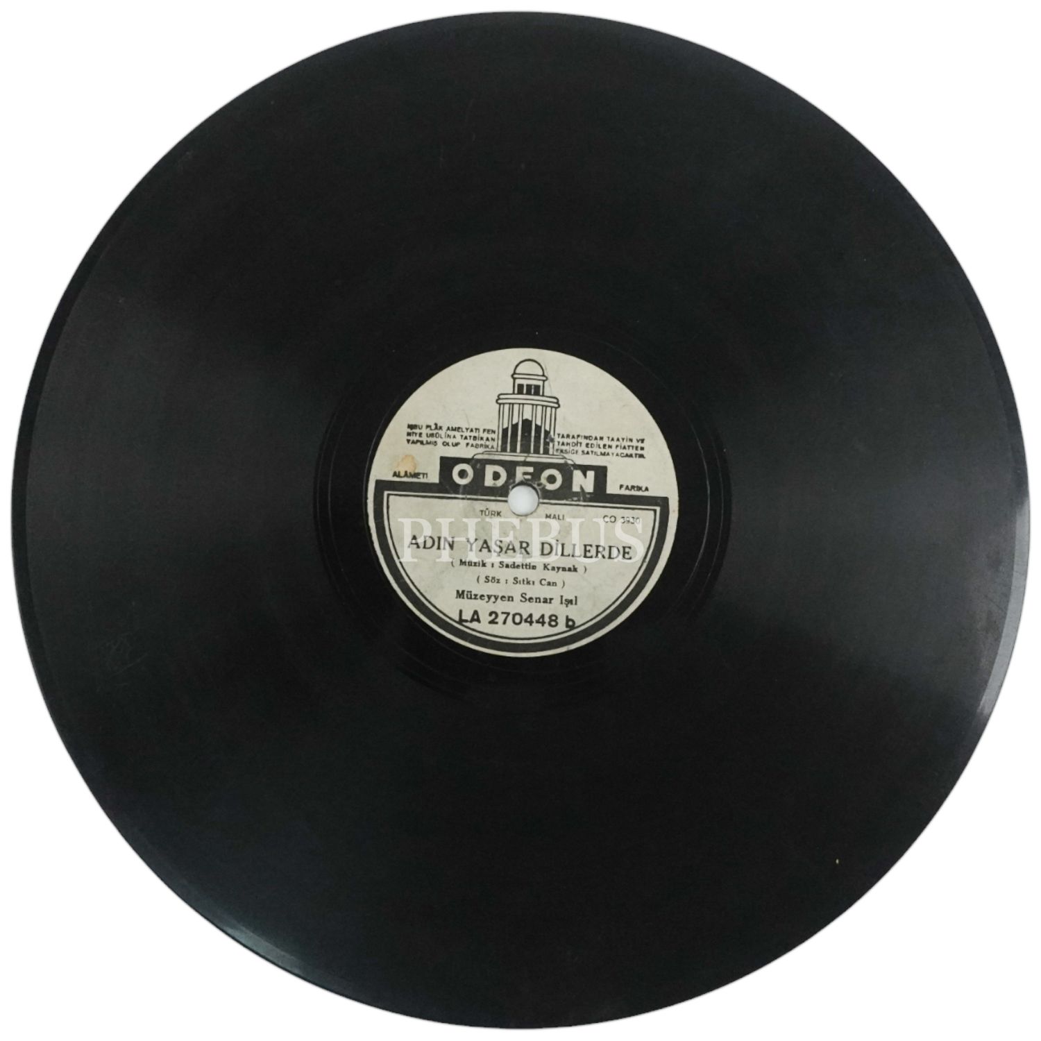 A YÜZÜ: ADIN YAŞAR DİLLERDE, B YÜZÜ: YOLLARINA GÜL DÖKTÜM, Müzik: Saadettin Kaynak, Söz: B. Hayriye, Seslendiren: Müzeyyen Senar Işıl, Odeon