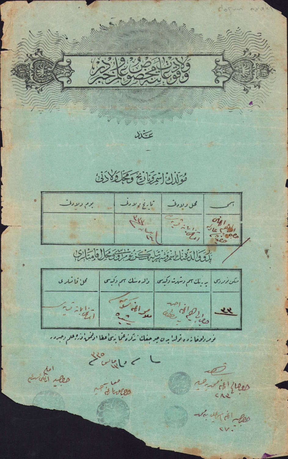Osmanlıca doğum belgesi, 'Veladet-i vukuata mahsus ilmühaber', 1335, bir kenarı kopuk, haliyle, 19x30 cm