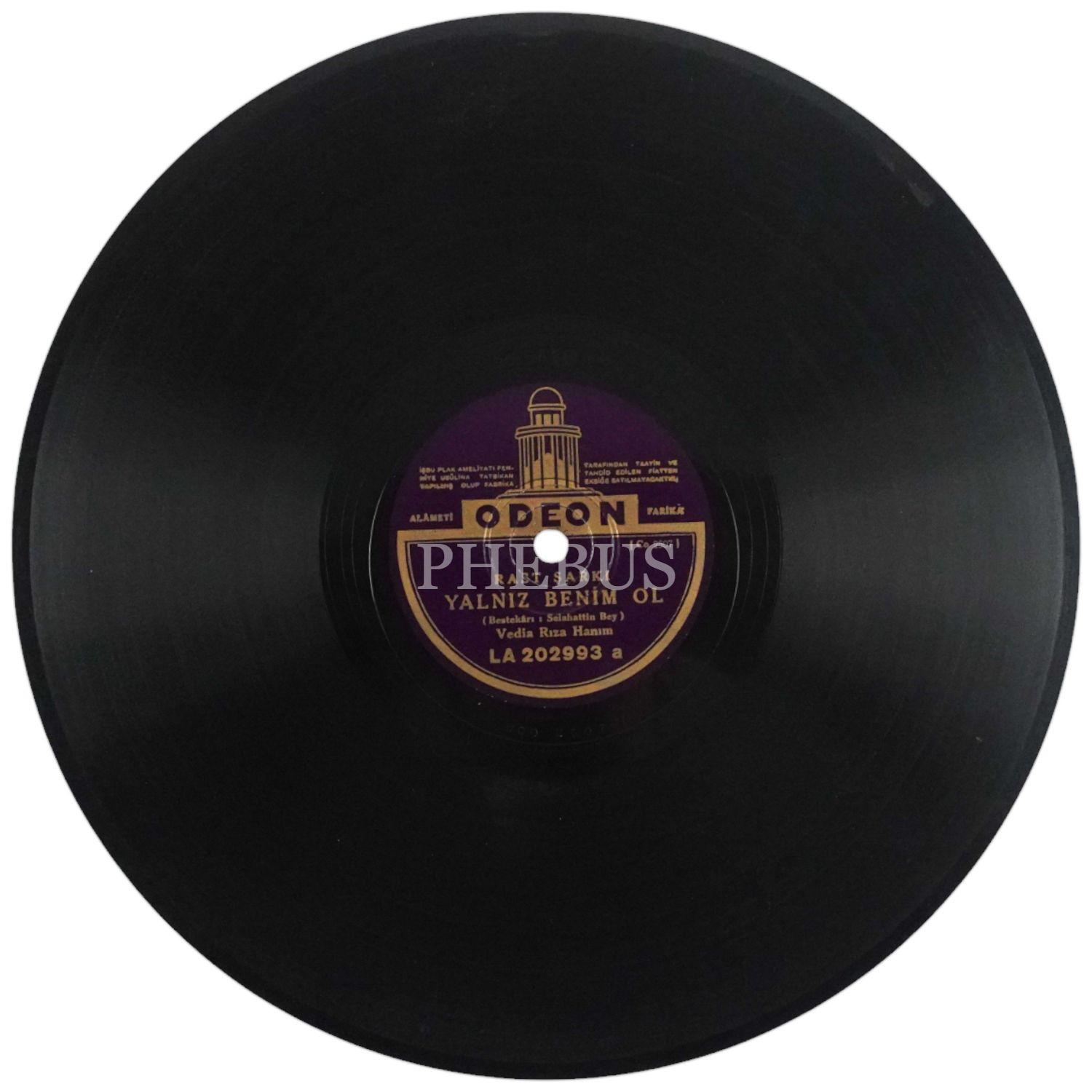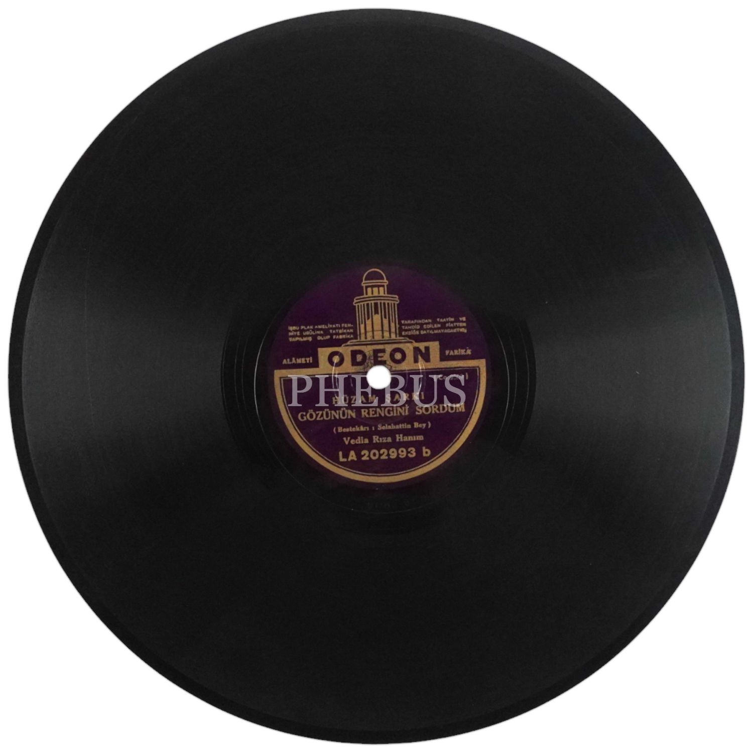 A YÜZÜ: GÖZÜNÜN RENGİNİ SORDUM, B YÜZÜ: YALNIZ BENİM OL, Müzik: Selahattin Bey, Seslendiren: Vedia Rıza Hanım, Odeon