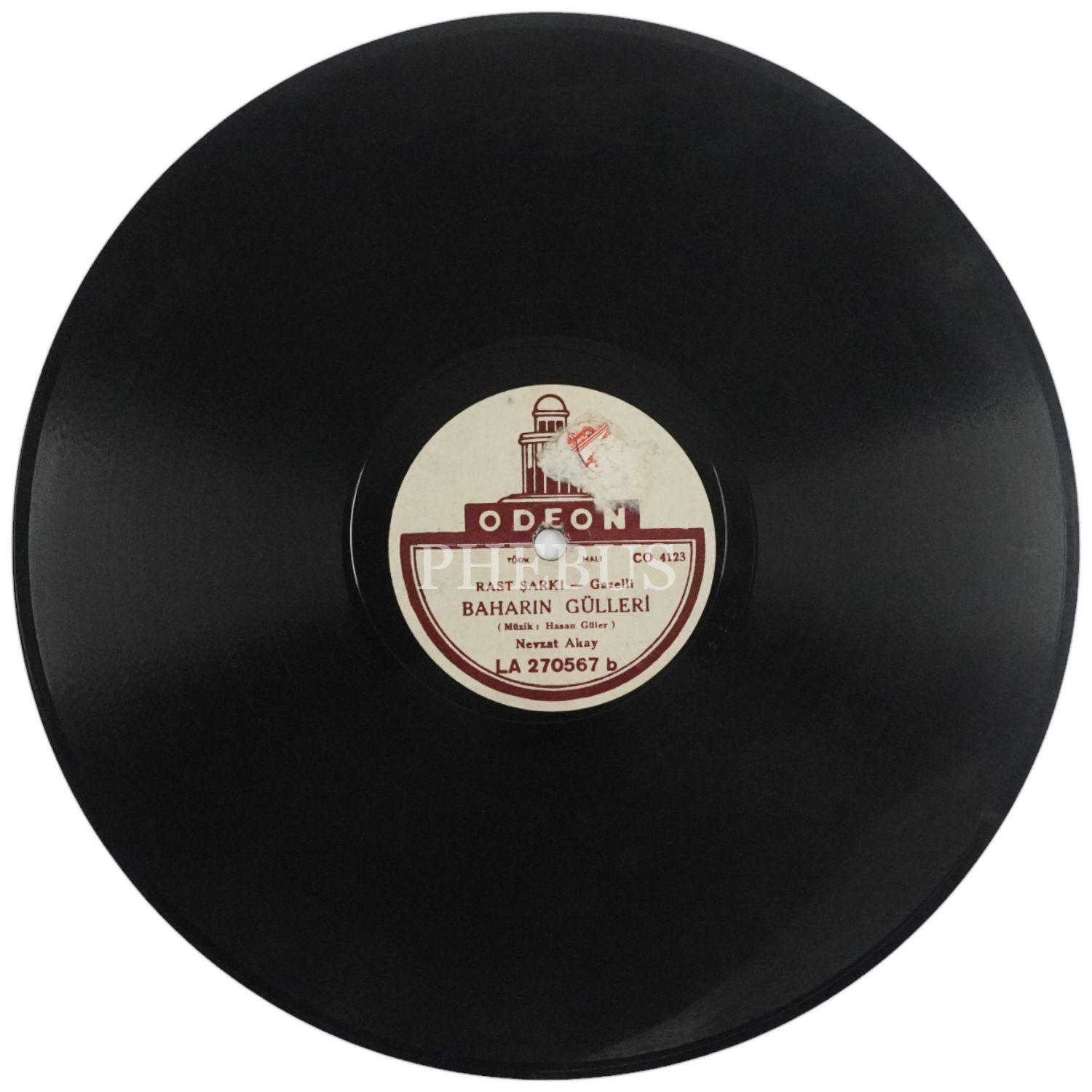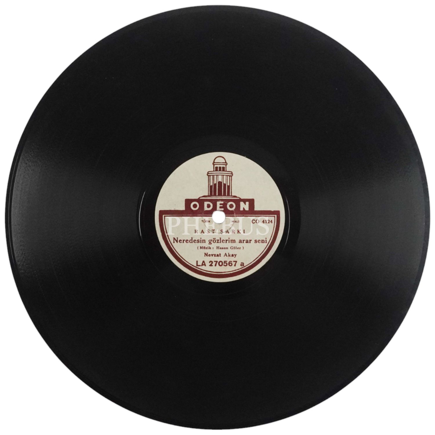 A YÜZÜ: NEREDESİN GÖZLERİM ARAR SENİ, B YÜZÜ: BAHARIN GÜLLERİ, Müzik: Hasan Güler, Seslendiren: Nevzat Akay, Odeon
