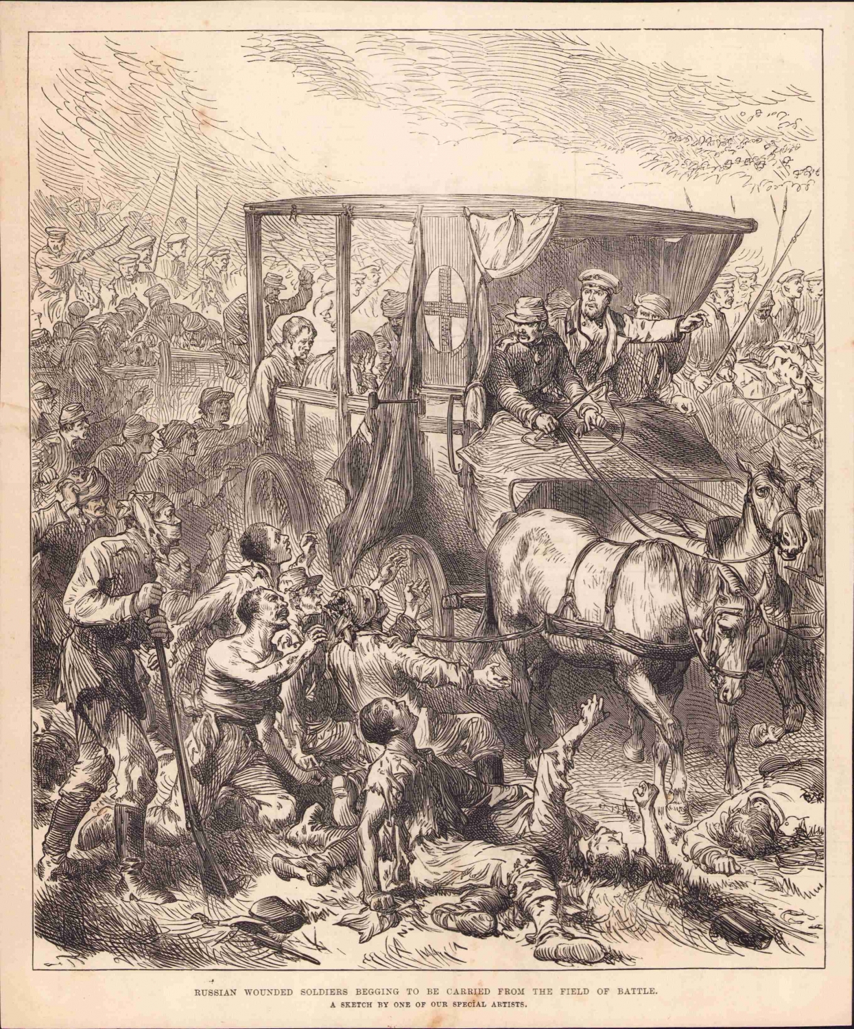 Türk - Rus Savaşı gravür, yaralı Rus askerleri savaş alanından çıkarılmak için yalvarıyor, 1877 dergiden kesilmiş, 22x28 cm