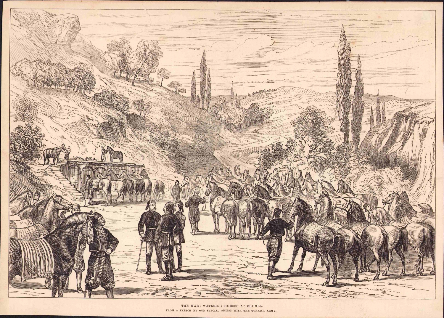 Türk - Rus Savaşı gravür, Türk ordusunda atların bakımı, 1877 dergiden kesilmiş, 32x23 cm