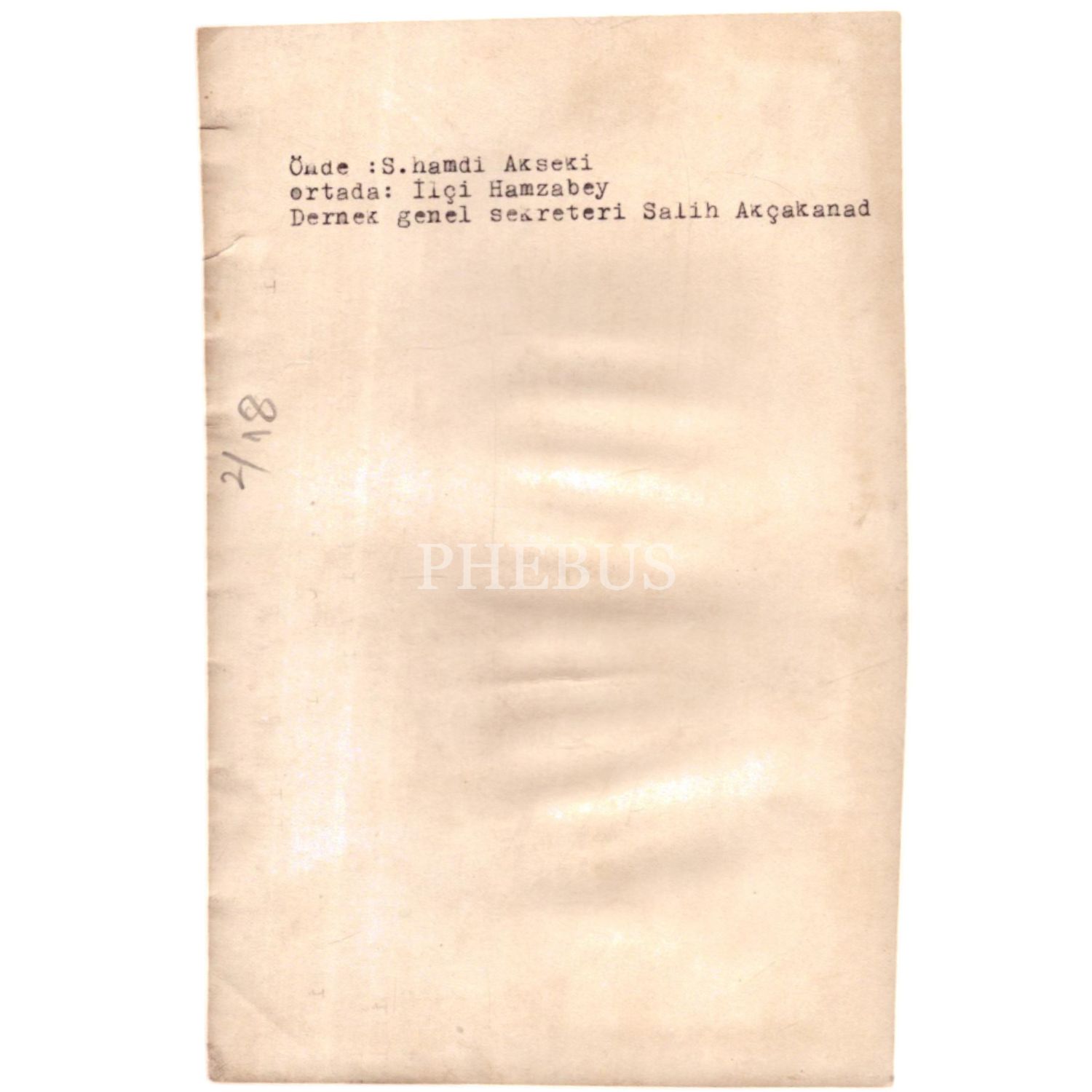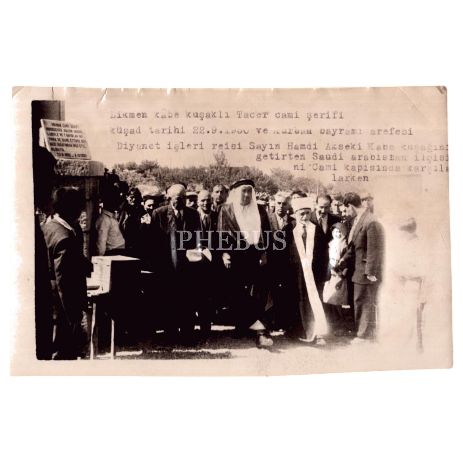 "Dikmen [K]âbe kuşaklı Tacer cami şerifi küşad tarihi 22.9.1950 Kurban bayramı arefesi Diyanet [İ]şleri reisi Sayın Hamdi Akseki Kabe kuşağını getirten Saudi [A]rabistan ilçisini Cami kapısında karşılarken"