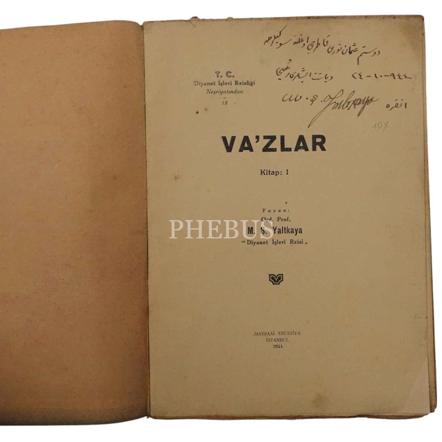 imzalı VA´ZLAR, M. Şerefettin Yaltkaya, Ebüzziya Matbaası, 1944, İstanbul, 120 sayfa, 25x18 cm...