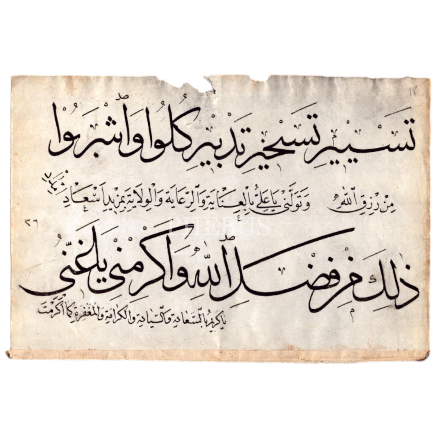 Tesyîr-i teshîr-i tedbîr-i ´Külû ve´şrabû min rizkı´llah..." Anlamı: "Allah´ın rızkından dilediğinizce yiyip içiniz..."