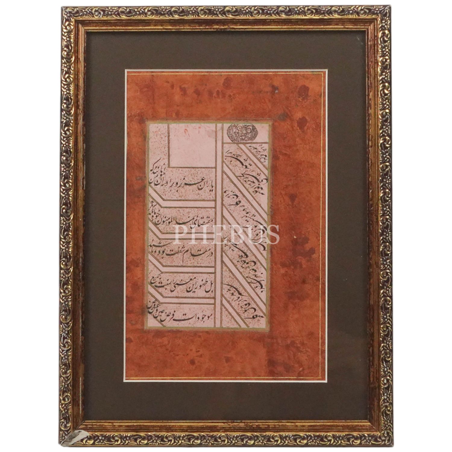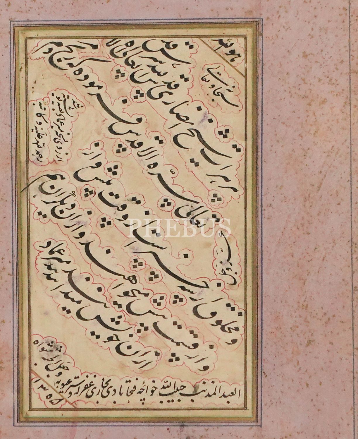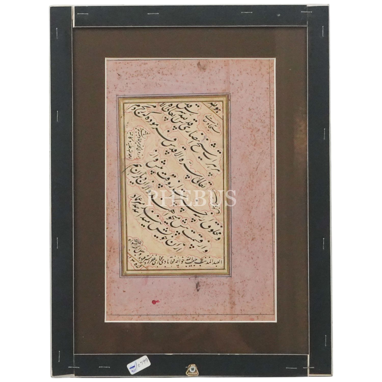 Çift taraflı Farsça talik mail çerçeve, Mirza abdullah ve Hâce Fethâbâdî Buhârî ketebeli, 1305 ve 1325 tarihli, yazı ölçü: 9x16 cm, çerçeve içi: 22x30 cm...