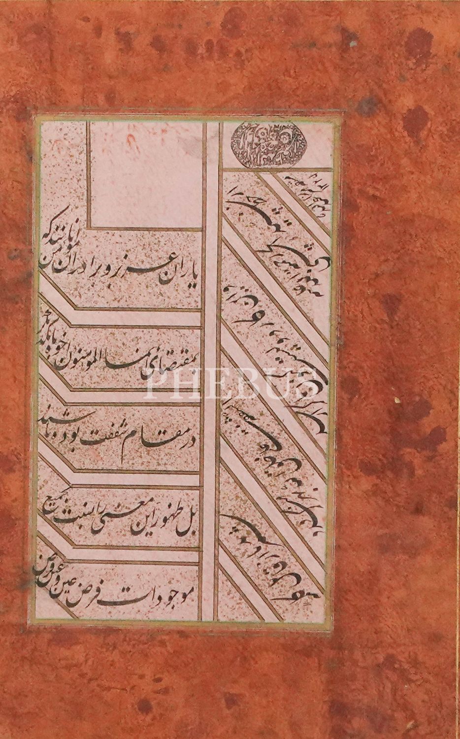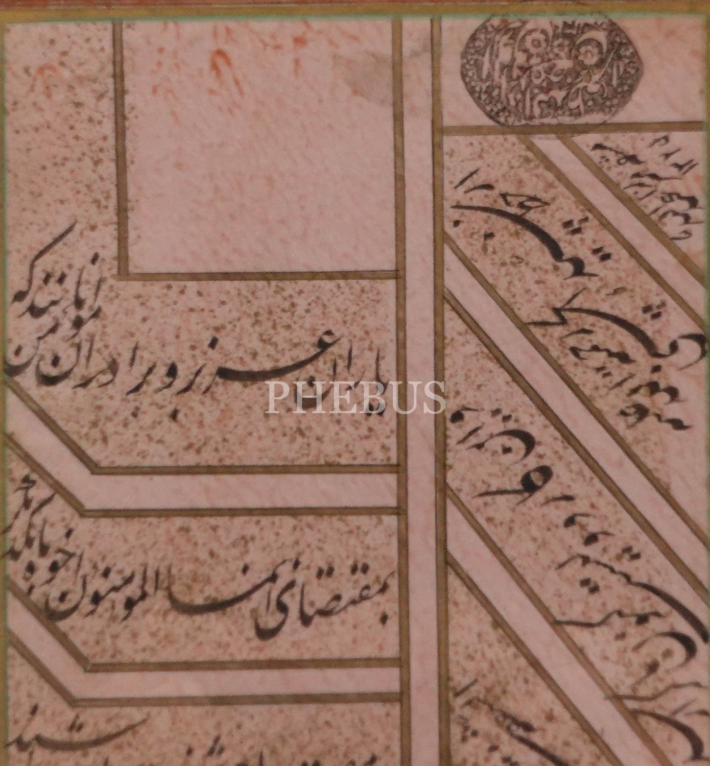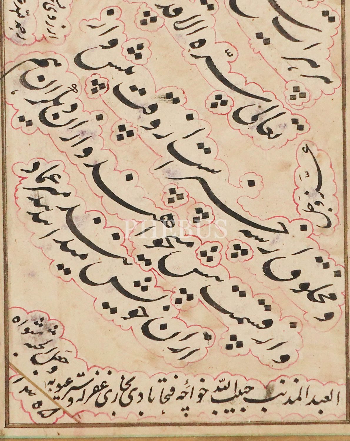 Çift taraflı Farsça talik mail çerçeve, Mirza abdullah ve Hâce Fethâbâdî Buhârî ketebeli, 1305 ve 1325 tarihli, yazı ölçü: 9x16 cm, çerçeve içi: 22x30 cm...