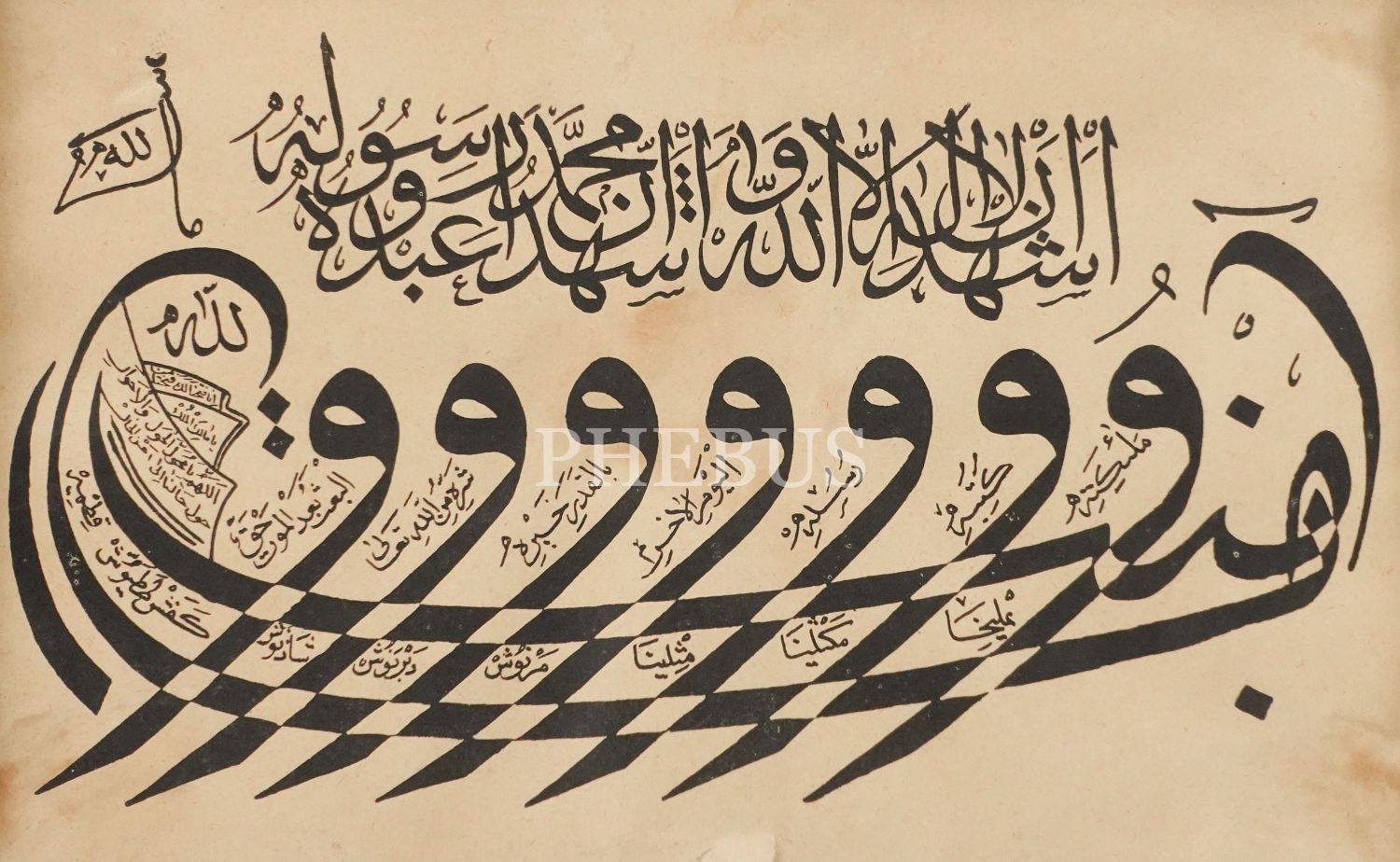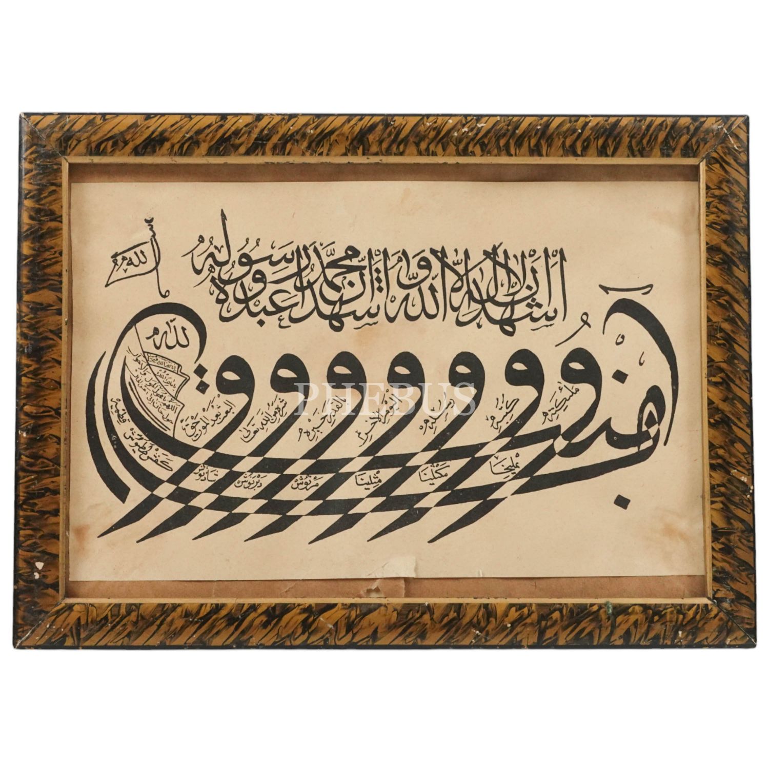 Sülüs istif baskı kelime-i şehâdet ve âmentü gemisi, çerçeve ölçü: 28x21 cm...