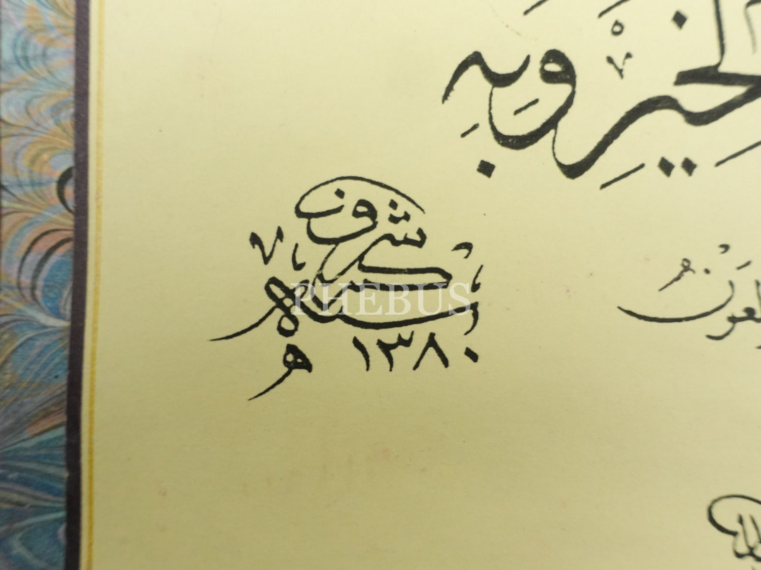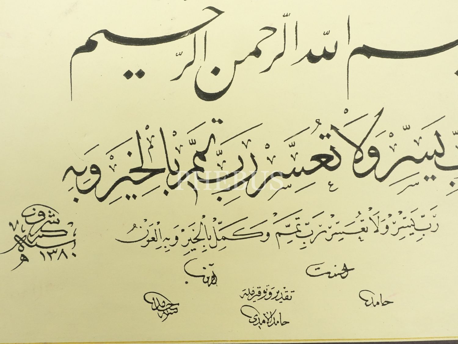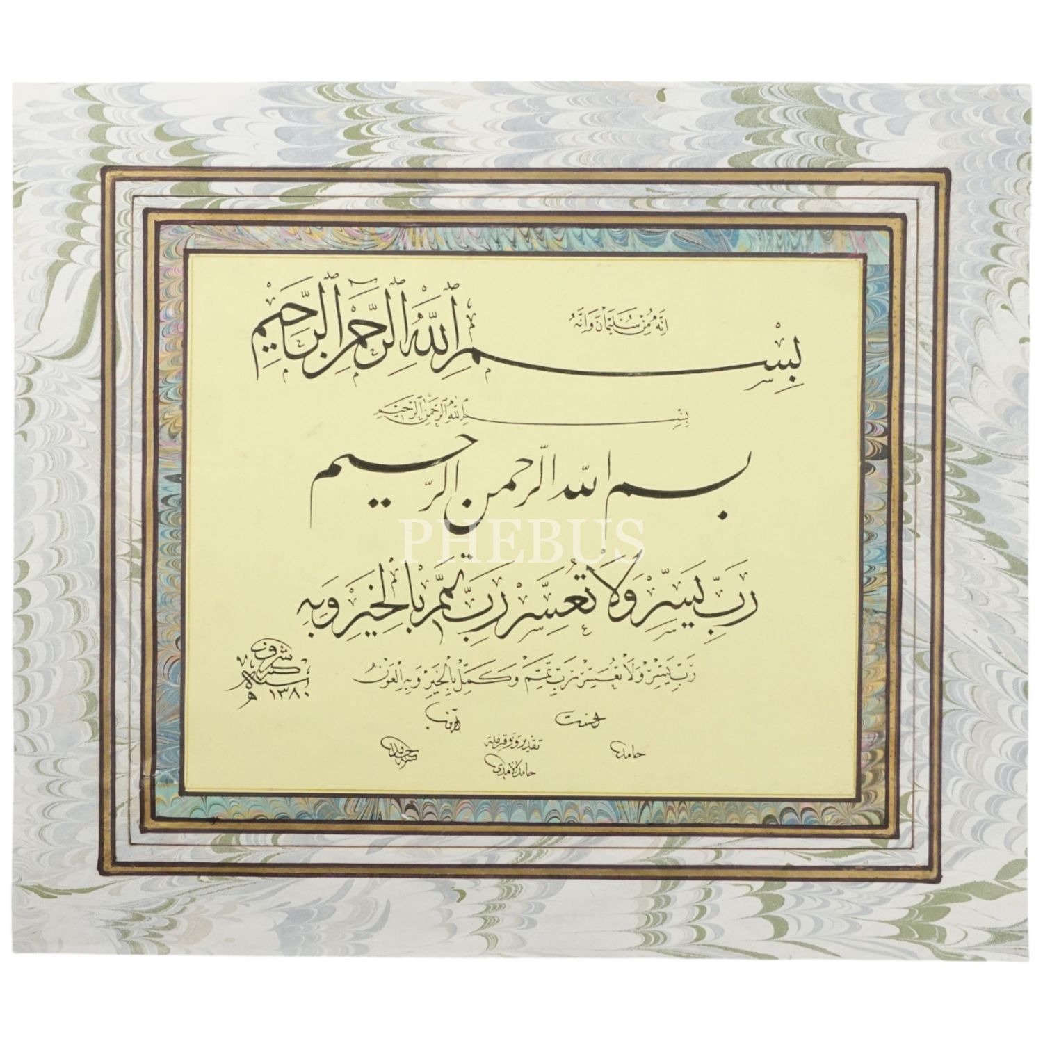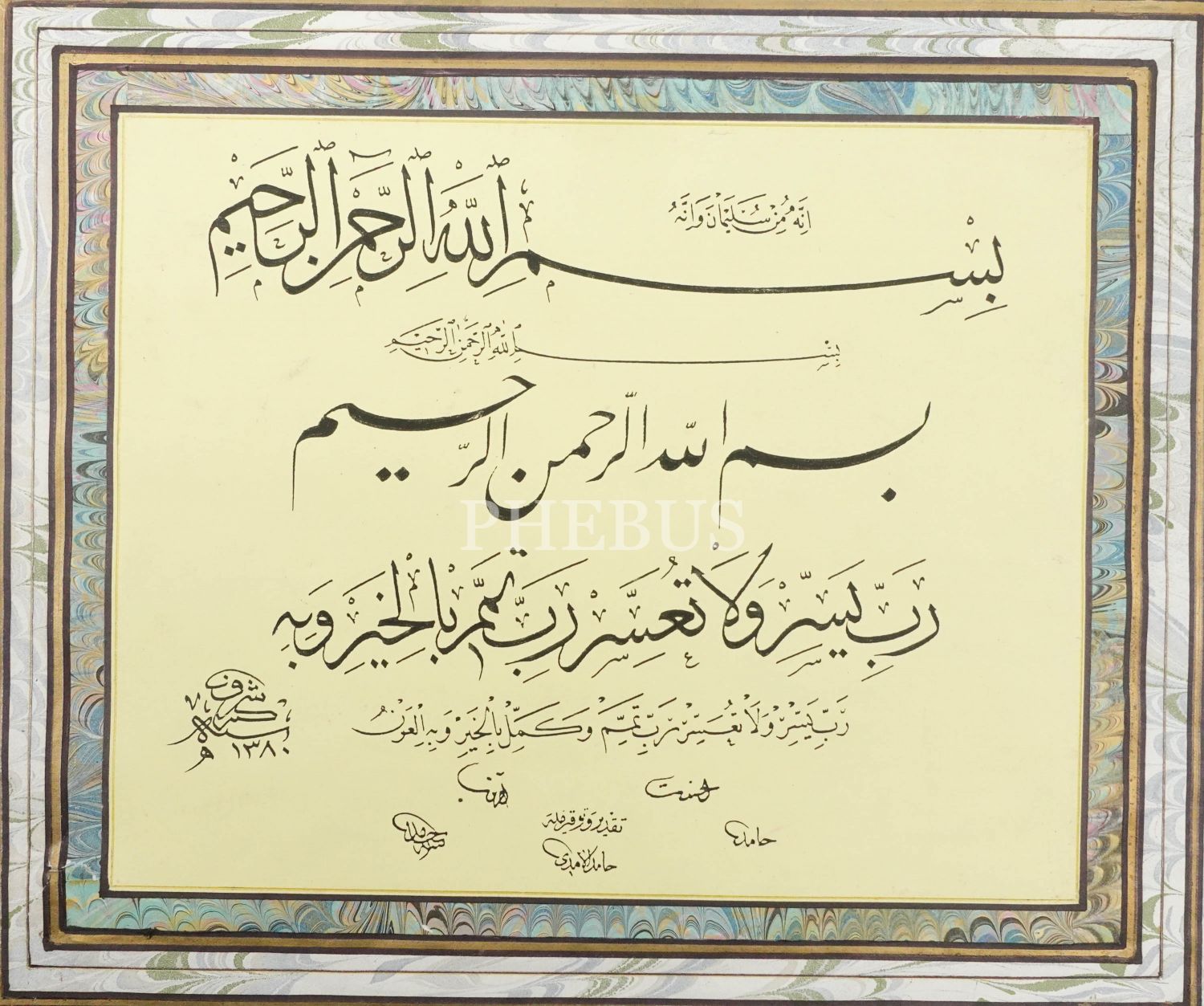 Hâmid ketebeli baskı hutut-i mütenevvia besmele ve Rabbi Yessir, pervazı ebrulu, yazı ölçü: 25x21 cm, kağıt ölçü: 39x34 cm...