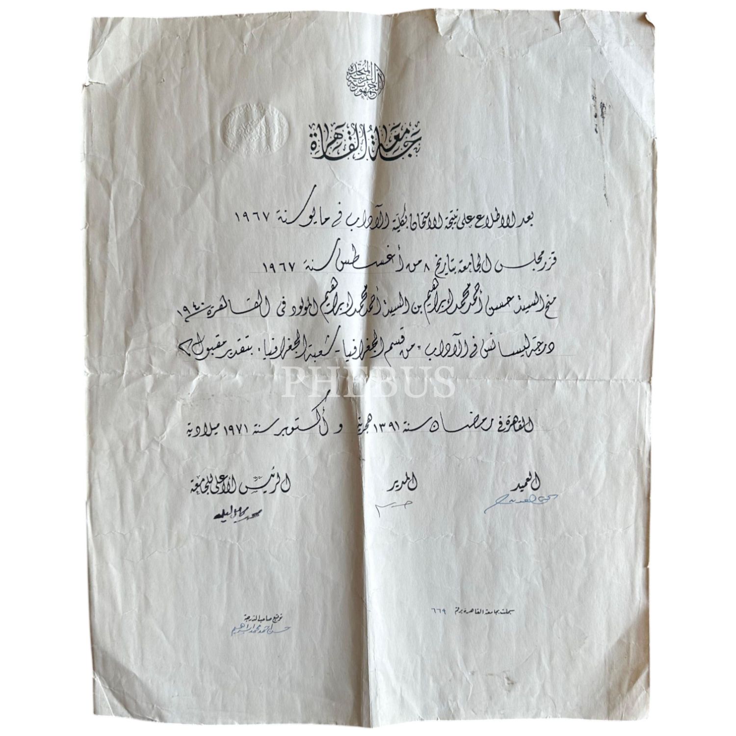 Kahire Üniversitesi Lisans Diploması, 1967 tarihli, 33x41 cm...