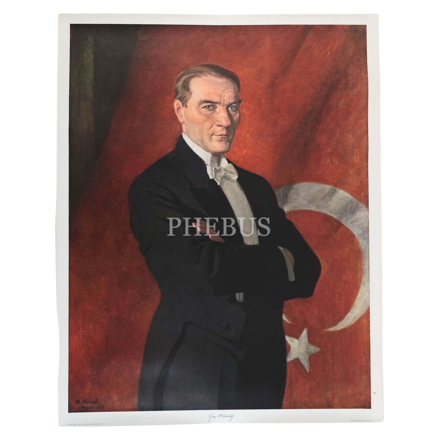 Ünlü Alman ressam Arthur Kampf´ın, Türk bayrağı önünde Mustafa Kemal Atatürk´ü tasvir ettiği tablosunun, Tayyare Cemiyeti menfaatine Viyana´da Hermes Matbaası´nda basılan afişi, 87x110 cm...