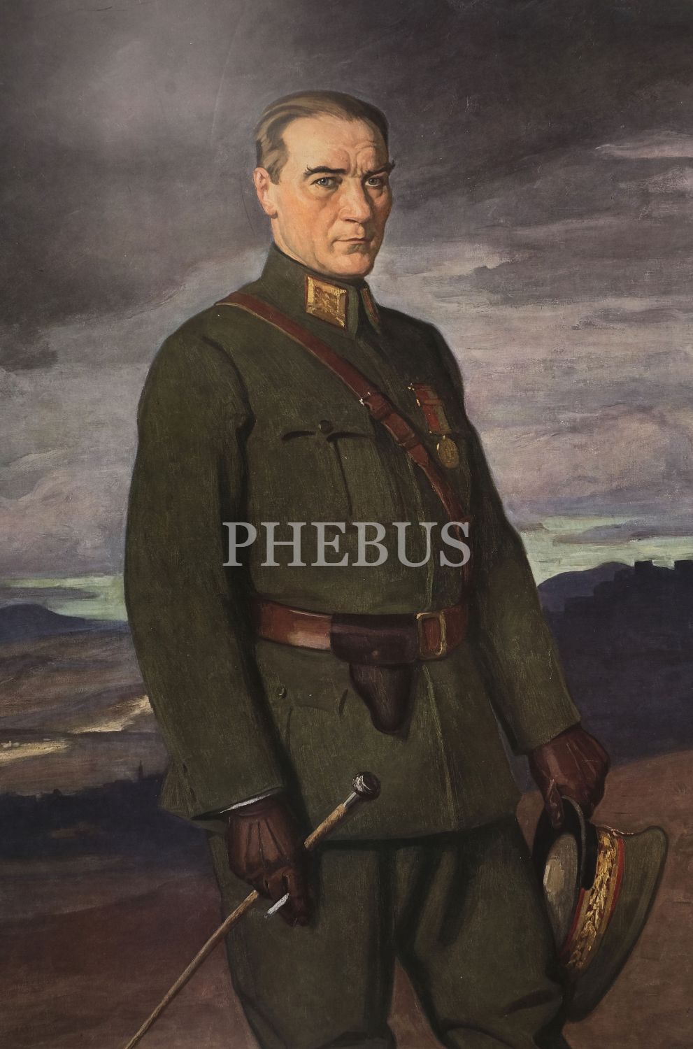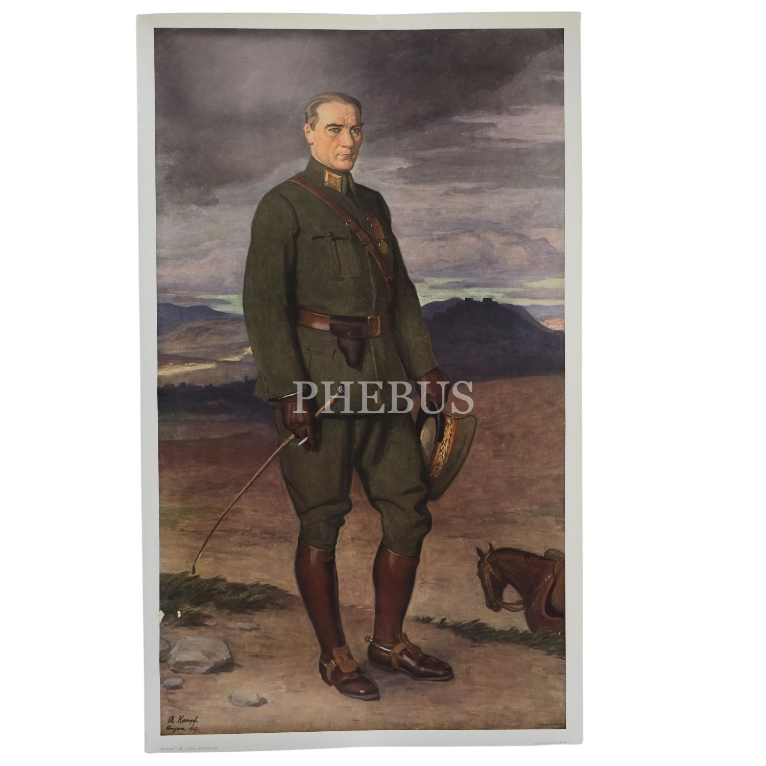 Ünlü Alman ressam Arthur Kampf´ın, Mustafa Kemal Atatürk'ü İstiklal Madalyası ve üniformasıyla tasvir ettiği tablosunun, Tayyare Cemiyeti menfaatine Viyana´da Hermes Matbaası´nda basılan afişi, 76x125 cm...
