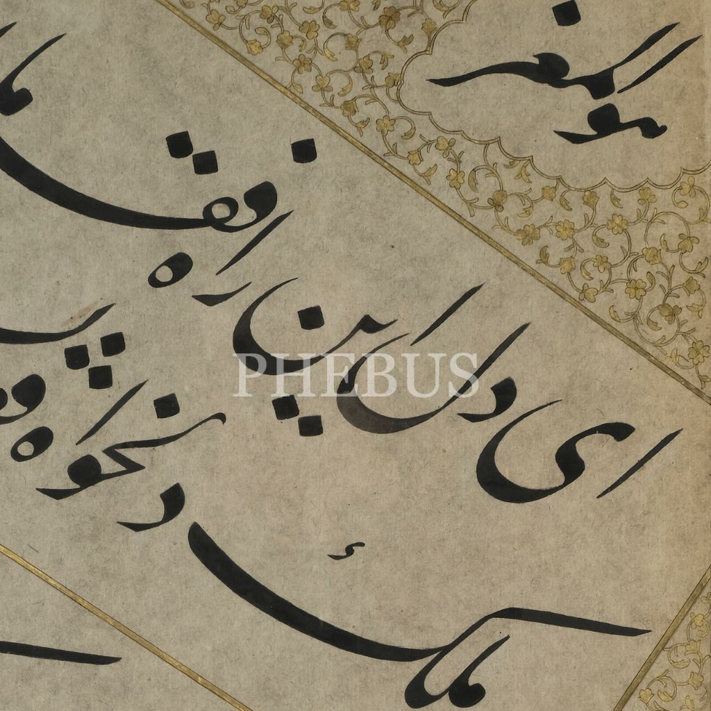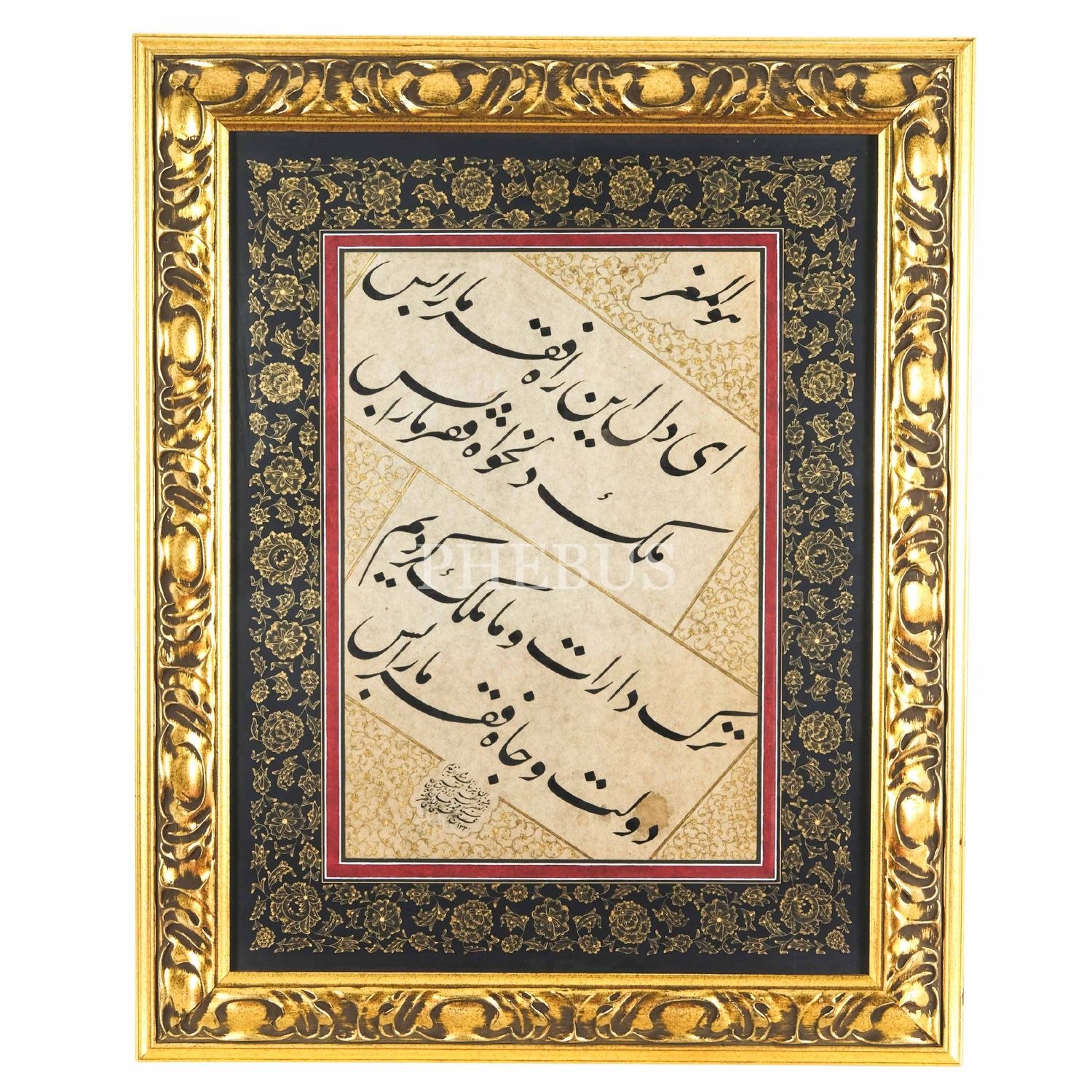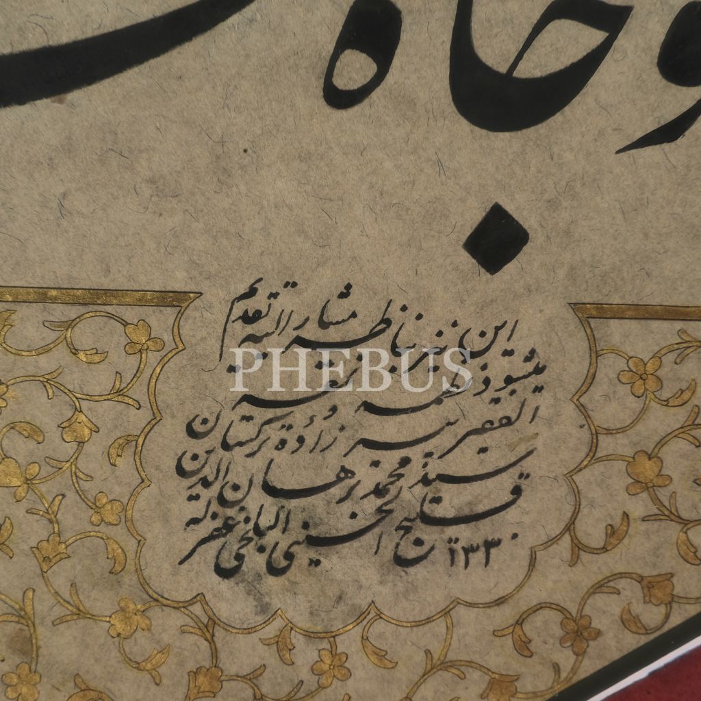 Burhaneddin Belhi ketebeli celî talik mail kıta, tezhipli, 1330 tarihli, yazı ölçü: 32x48 cm, çerçeve içi ölçü: 49x65 cm...