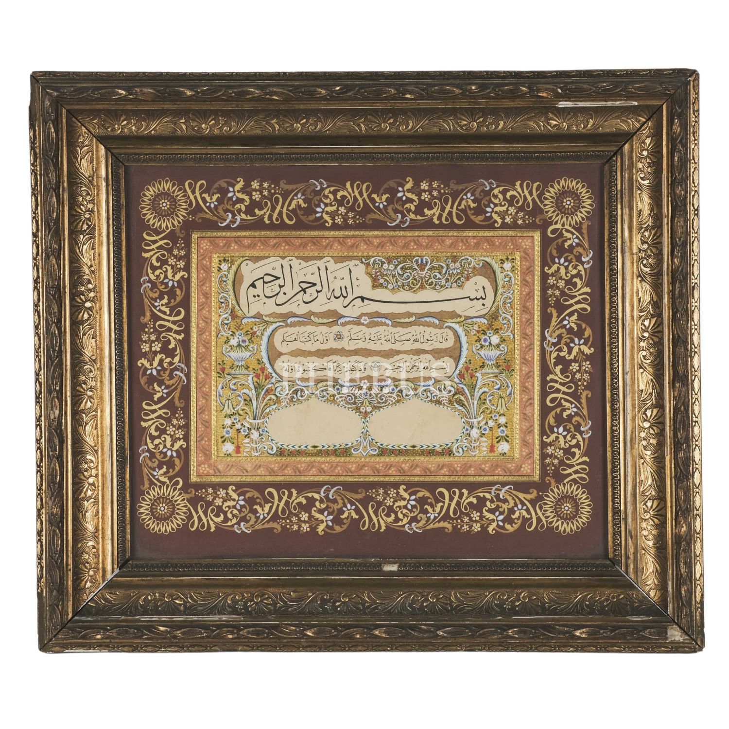 Sülüs-nesih icazet kıtası, altın cetvelli, altın duraklı, tahrirli ve tezhipli, yazı ölçü: 21x14 cm, çerçeve ölçü: 47x42 cm...