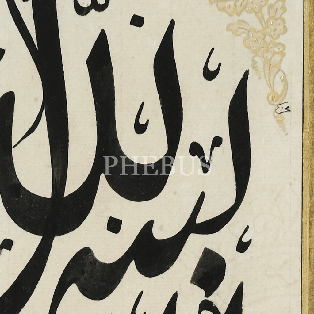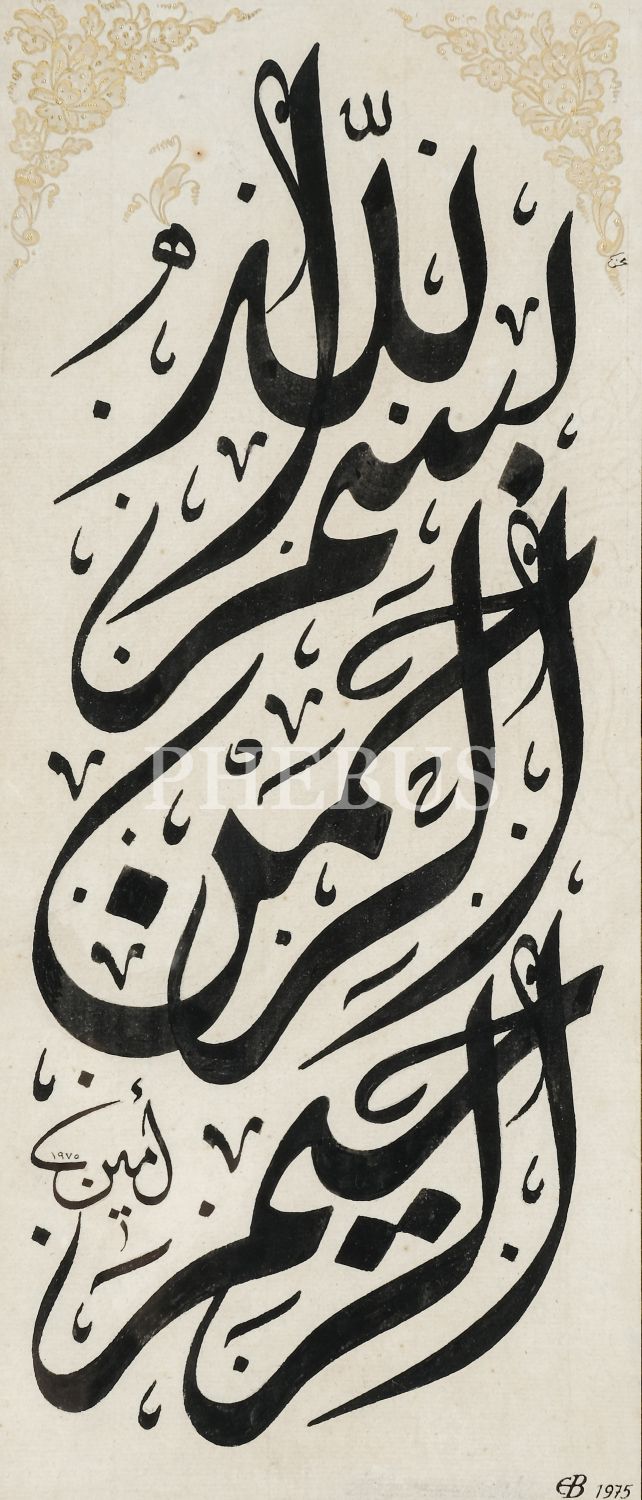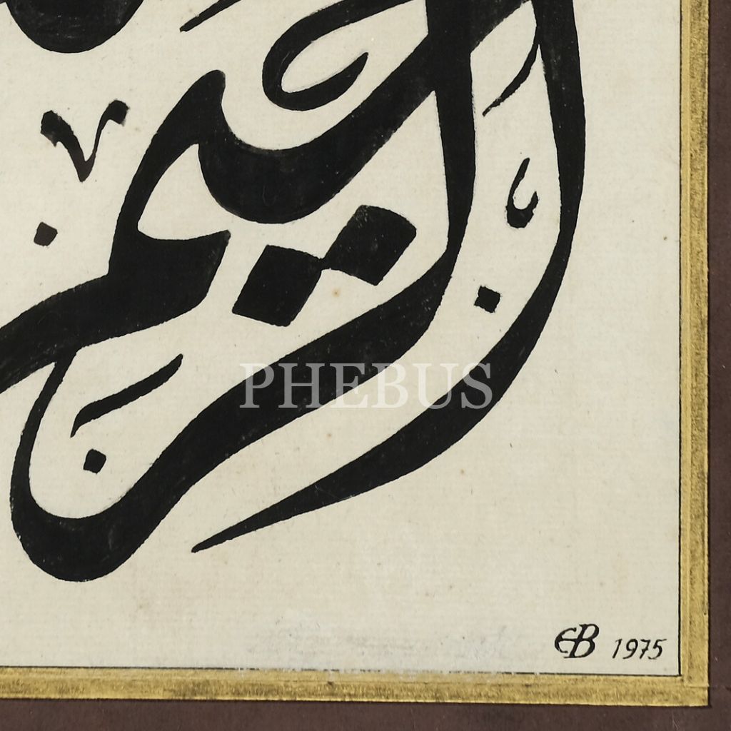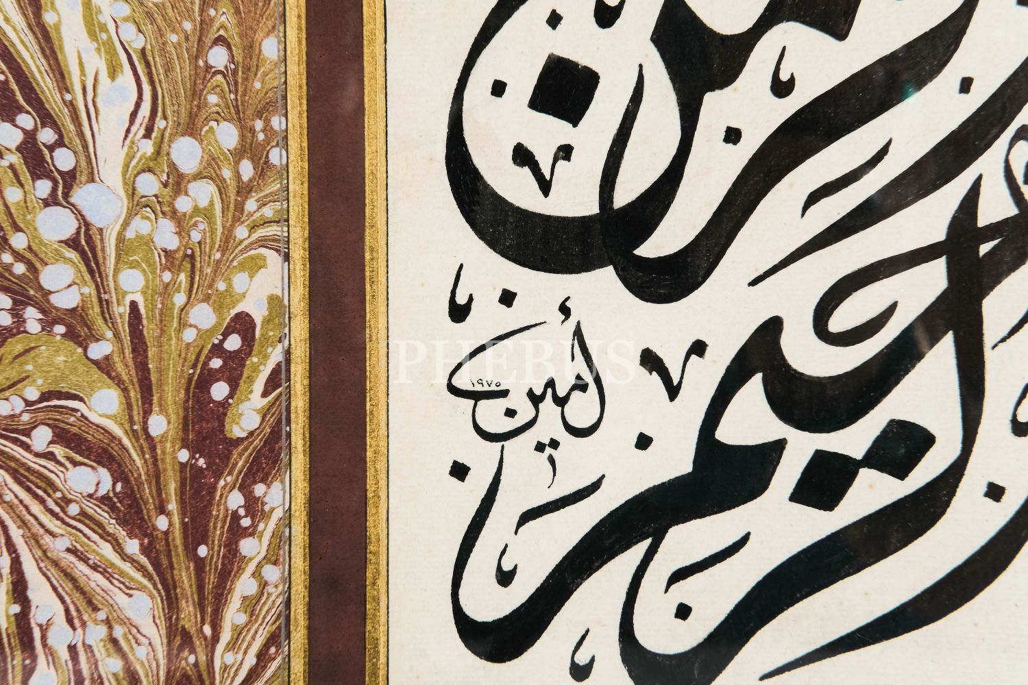 Emin Barın ketebeli celî divanî istif besmele, 1975 tarihli, (Tezhib Muhsin Demironat imzalı) yazı ölçü: 11x26 cm, çerçeve içi: 26x41 cm...