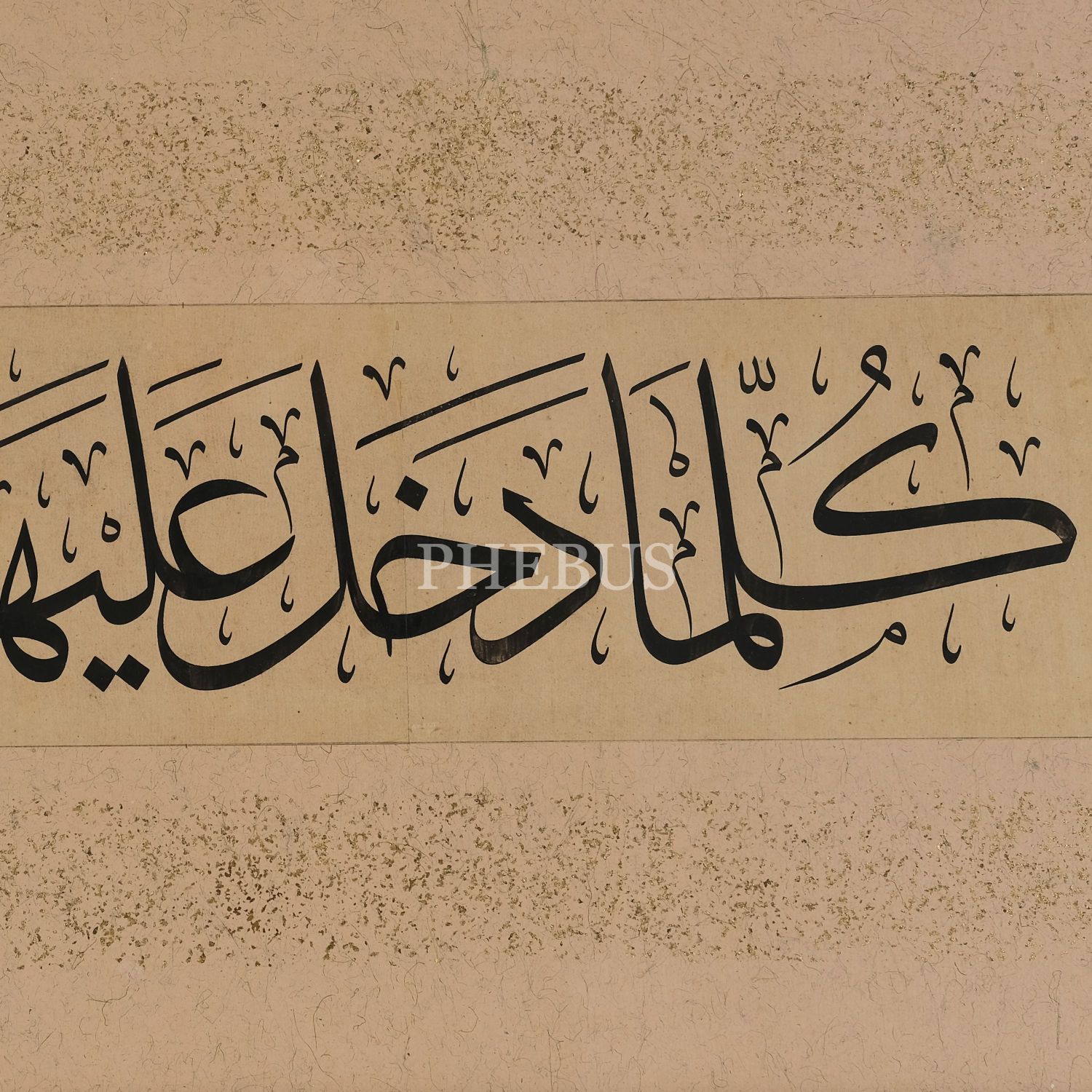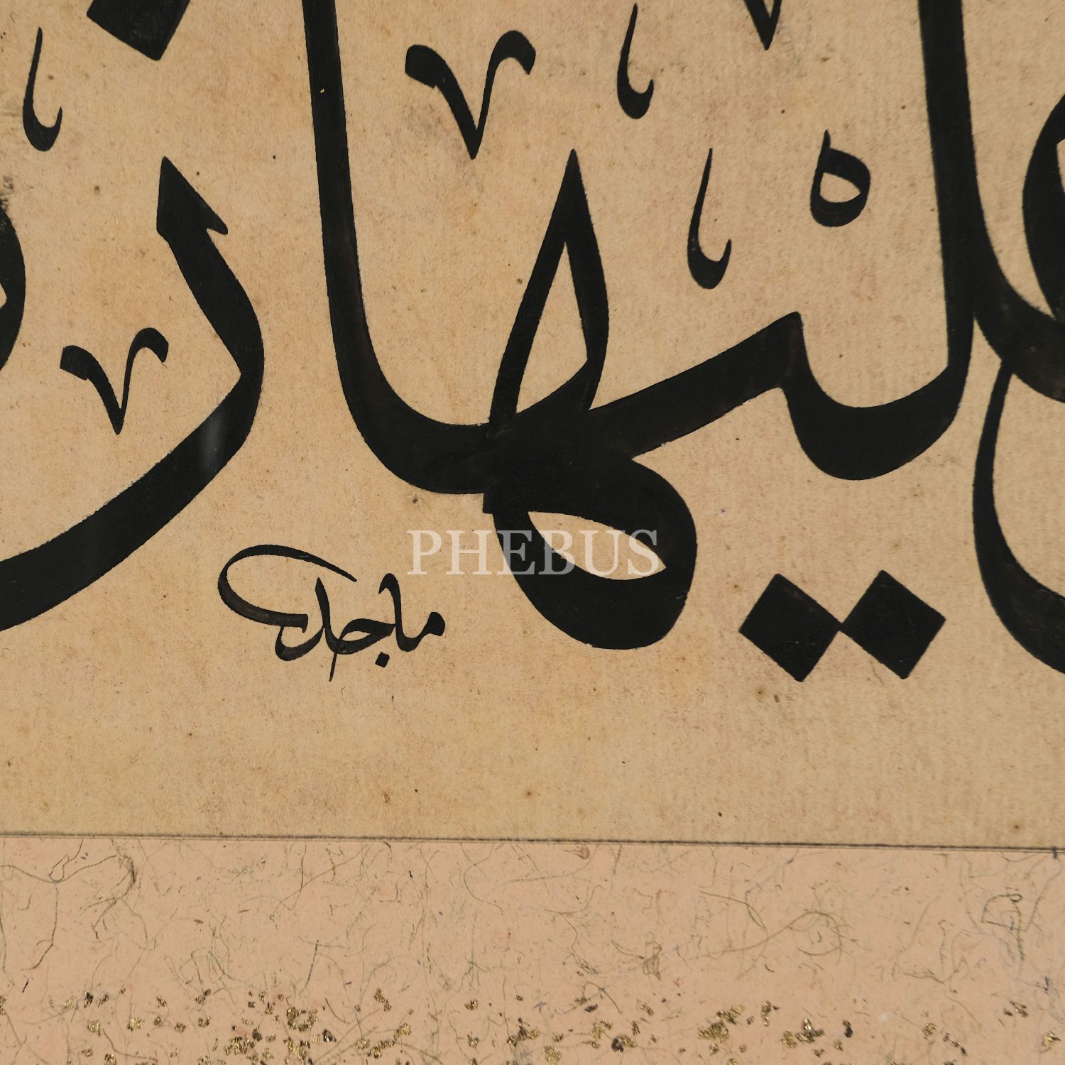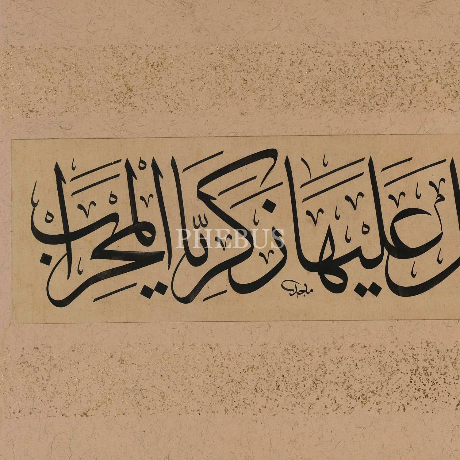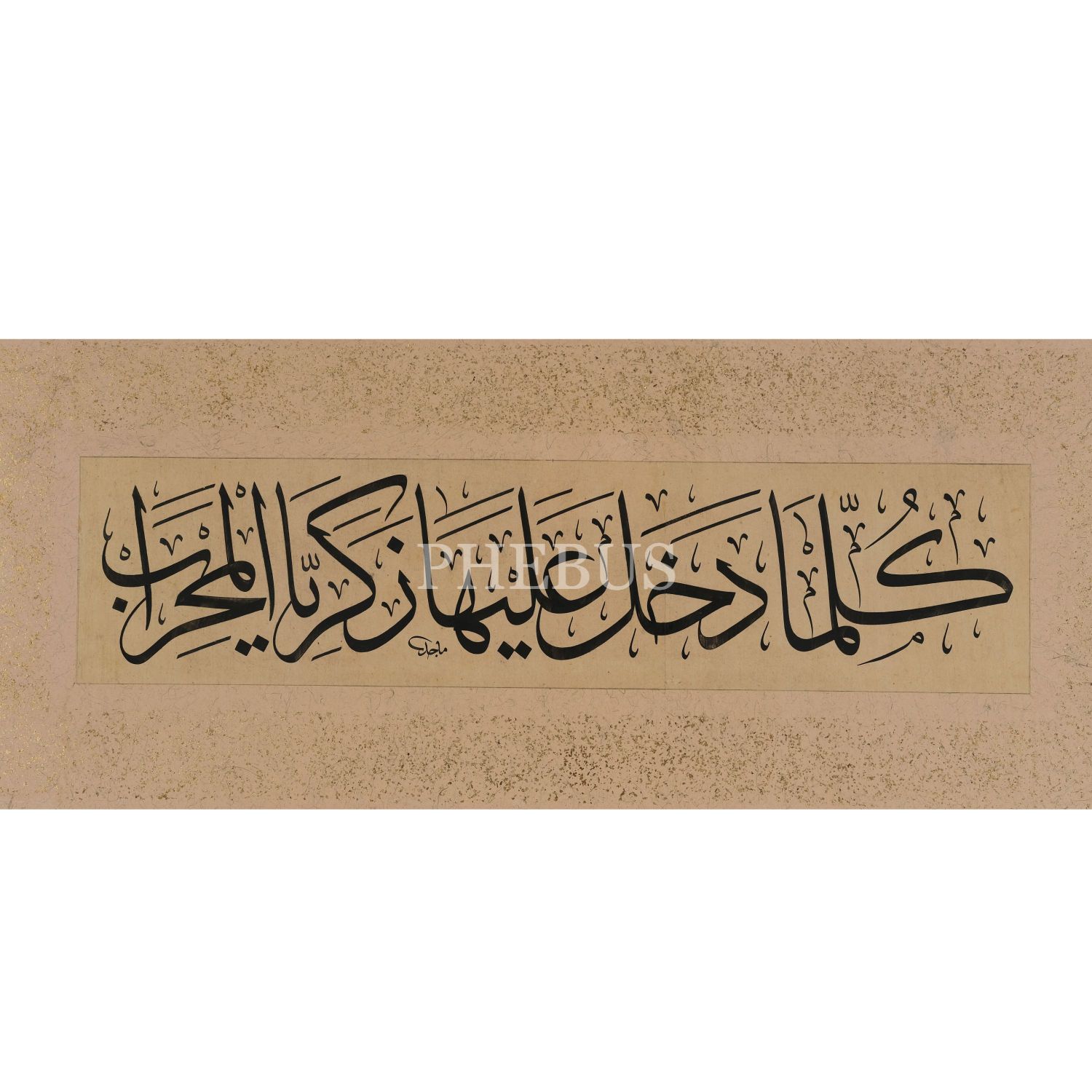 Mâcid Ayral ketebeli celî sülüs mihrap âyeti, pervazı zerefşanlı, yazı ölçü: 53x13 cm, paspartu ölçü: 73x33 cm...