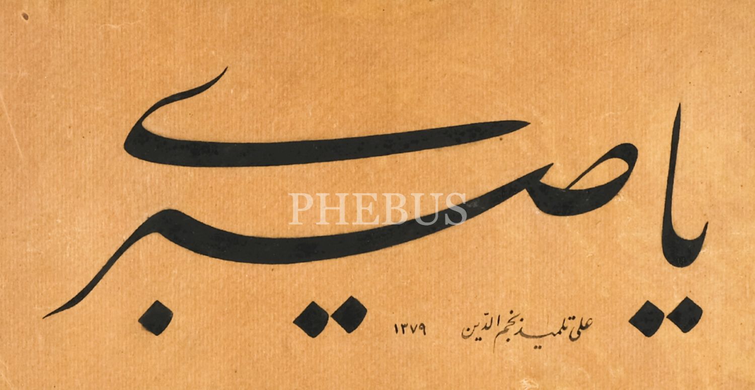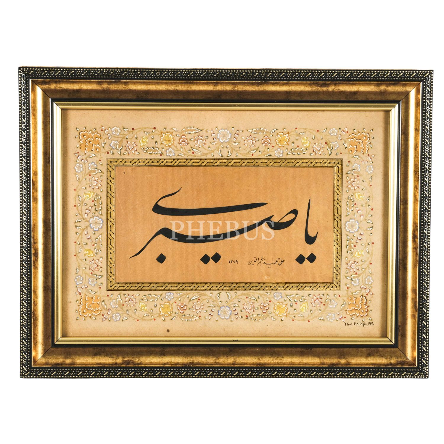 Ali Alparslan ketebeli celî talik levha, hicri 1379 tarihli, tezhip Mine Balioğlu 1963, çerçeve içi ölçü 32x23 cm...