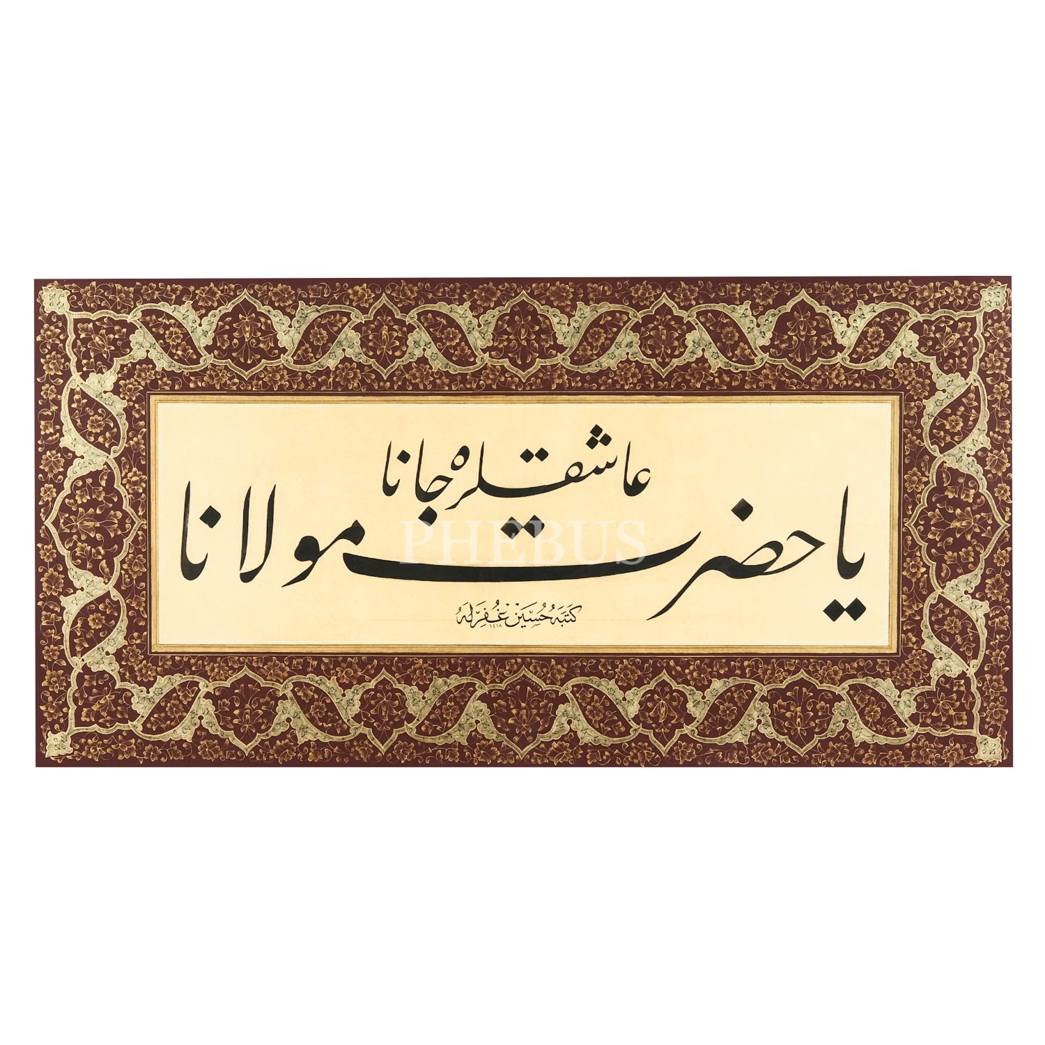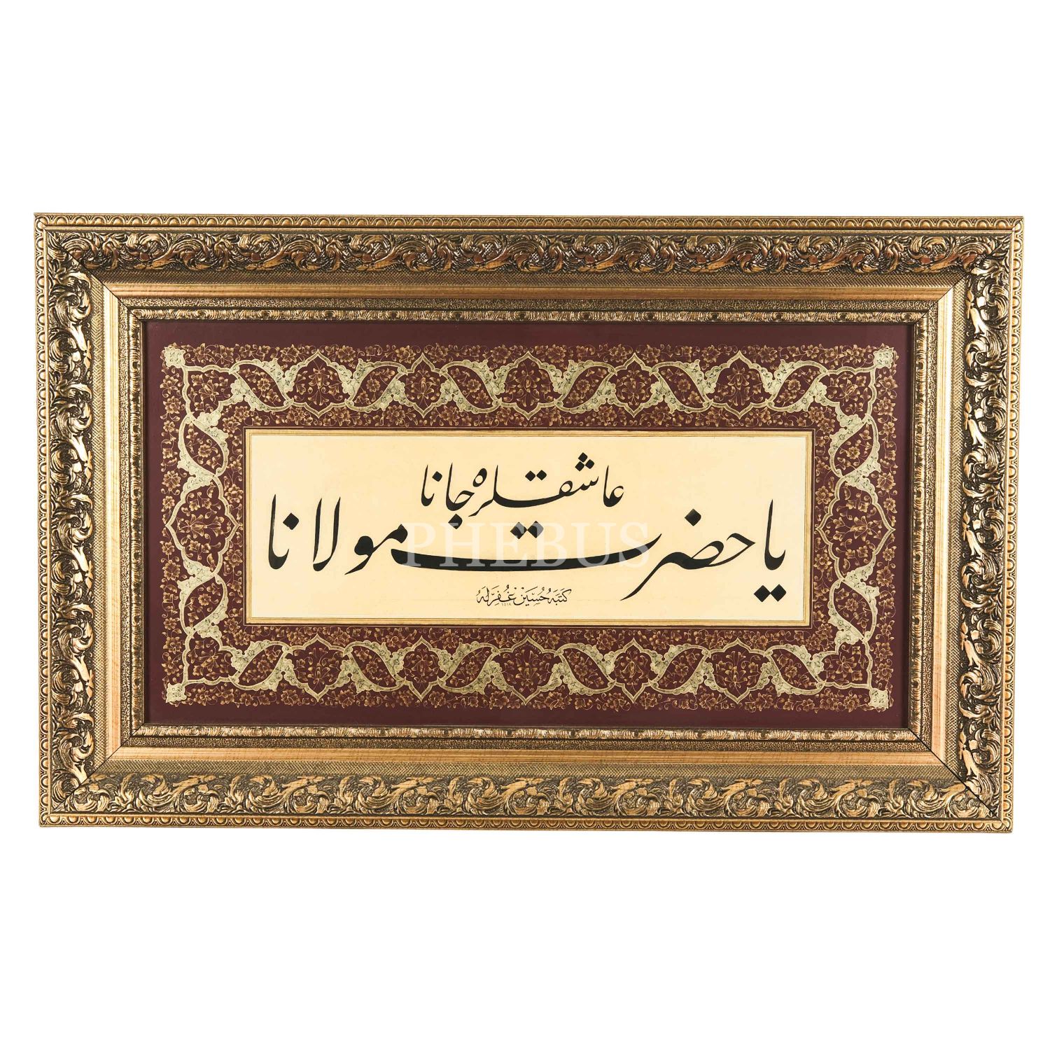 Hüseyin Kutlu ketebeli celî talik levha, 1418 tarihli, (tezhip: Semih İrteş 1990), yazı ölçü: 50x16 cm, çerçeve içi ölçü: 68x35 cm...