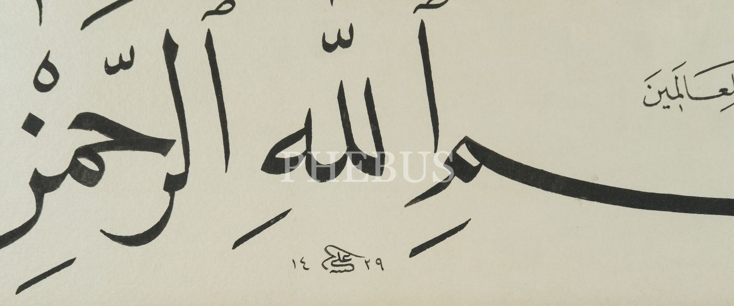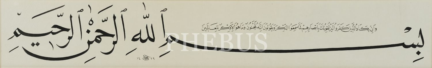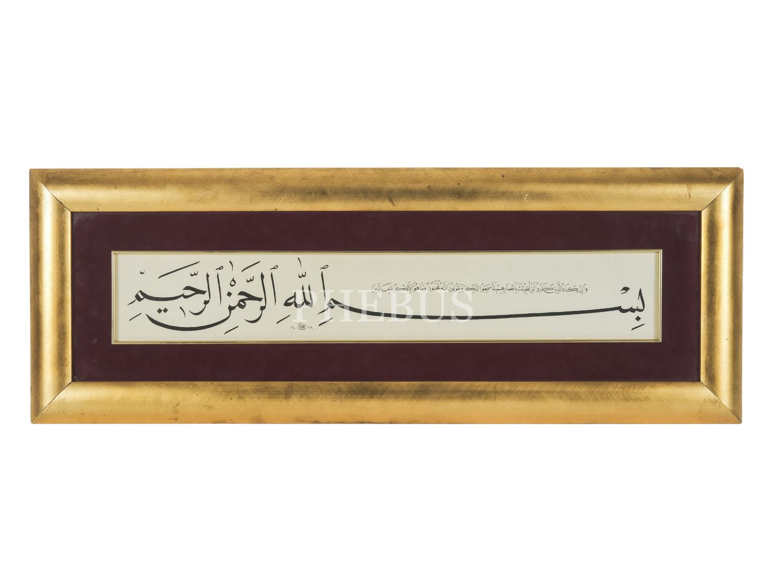 Ali Hüsrevoğlu ketebeli celî nesih besmele ve nazar ayeti, 1429 tarihli, yazı ölçü: 63x10, çerçeve ölçü: 30x84 cm...