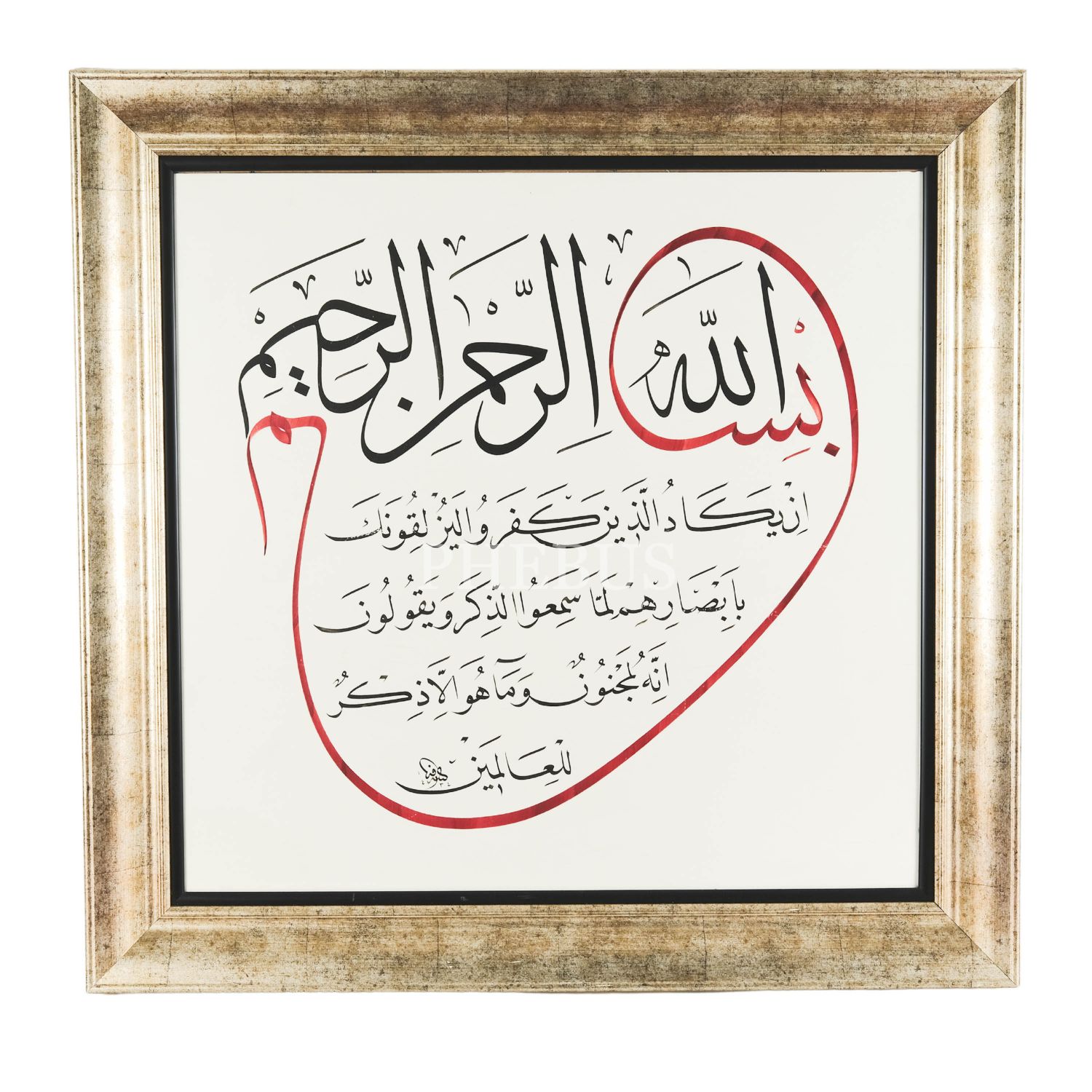 Farklı bir tasarım olarak vav şeklinde başlayan celî sülüs besmele ve celî nesih nazar duası (Kalem suresi 51. âyet):