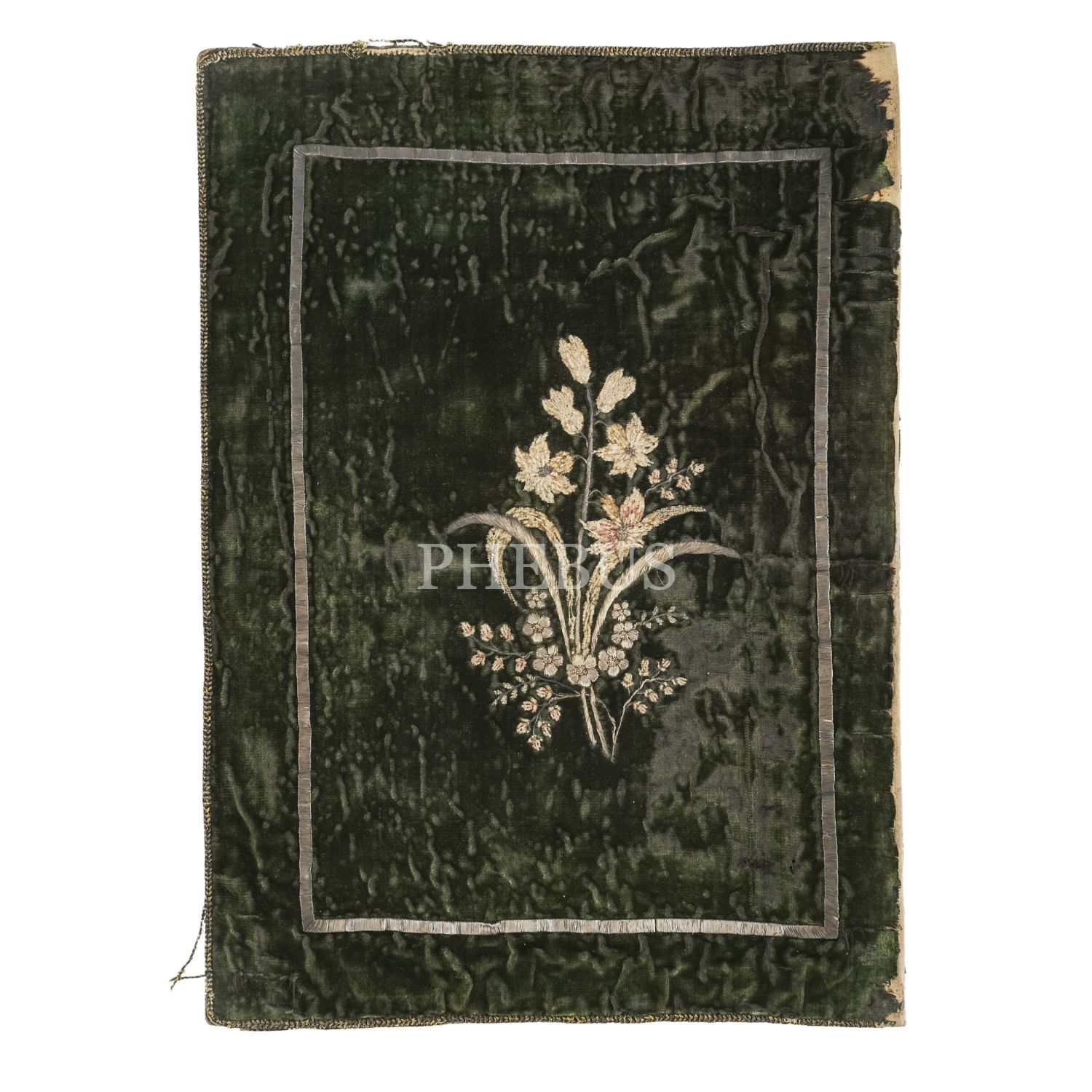 Osmanlı dönemi çiçek işlemeli ve yeşil kadife kaplı deri cilbent, 31x22 cm...
