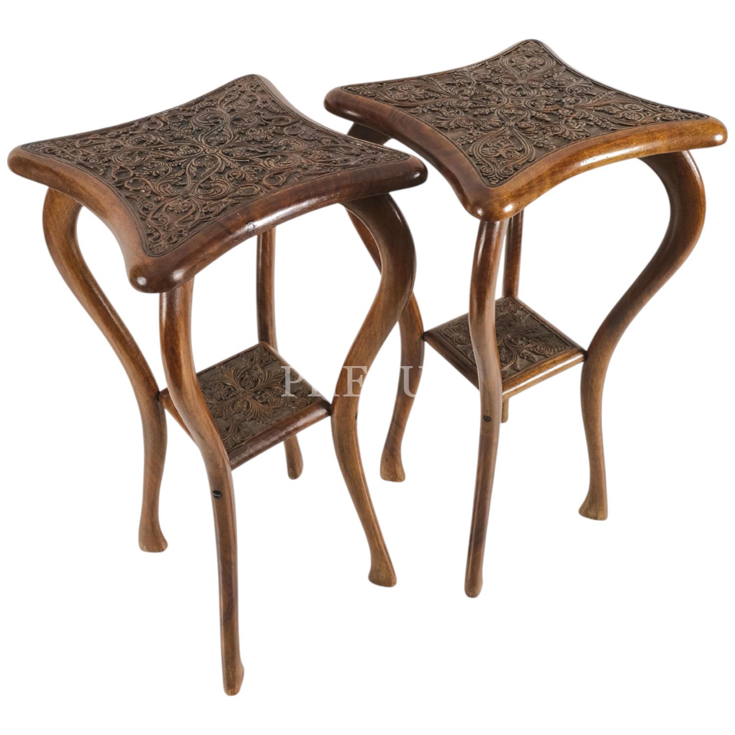 Osmanlı döneminden, her birinin alt kısmında ustasının ismi ve imal tarihi yazılı (Halid - 1325) bir çift sehpa takımı, 22x22x35 cm...