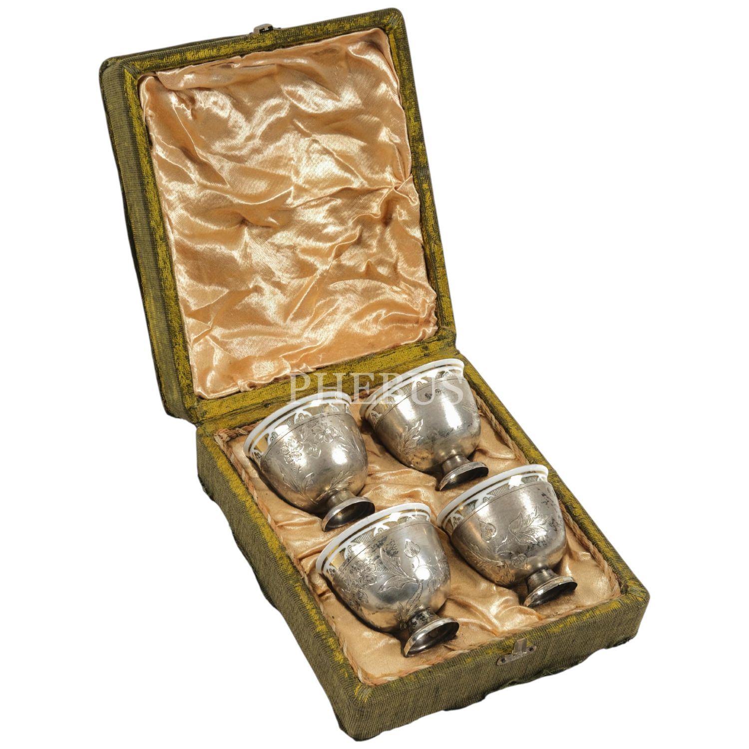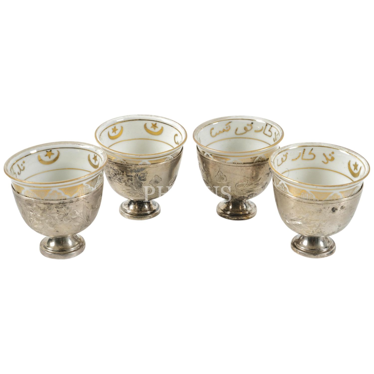 İç kenarları Osmanlıca yazılı ve ay yıldız işlemeli, floral desenlerle süslenmiş tuğralı ve "sah" damgalı gümüş zarfları ile dört parçalık fincan takımı, orijinal kutusu 16x19x8 cm, gümüş zarfların ağırlığı 112 gr...