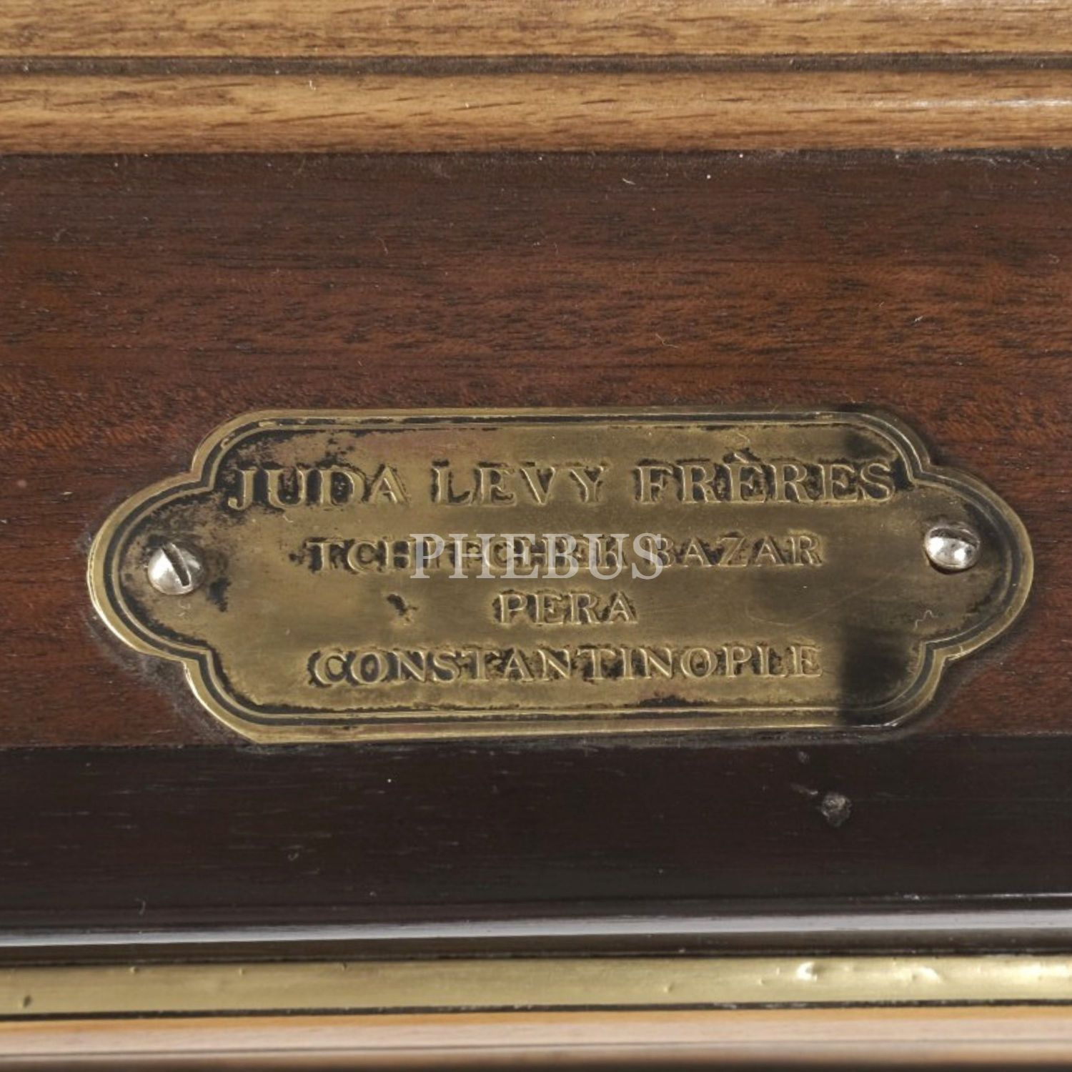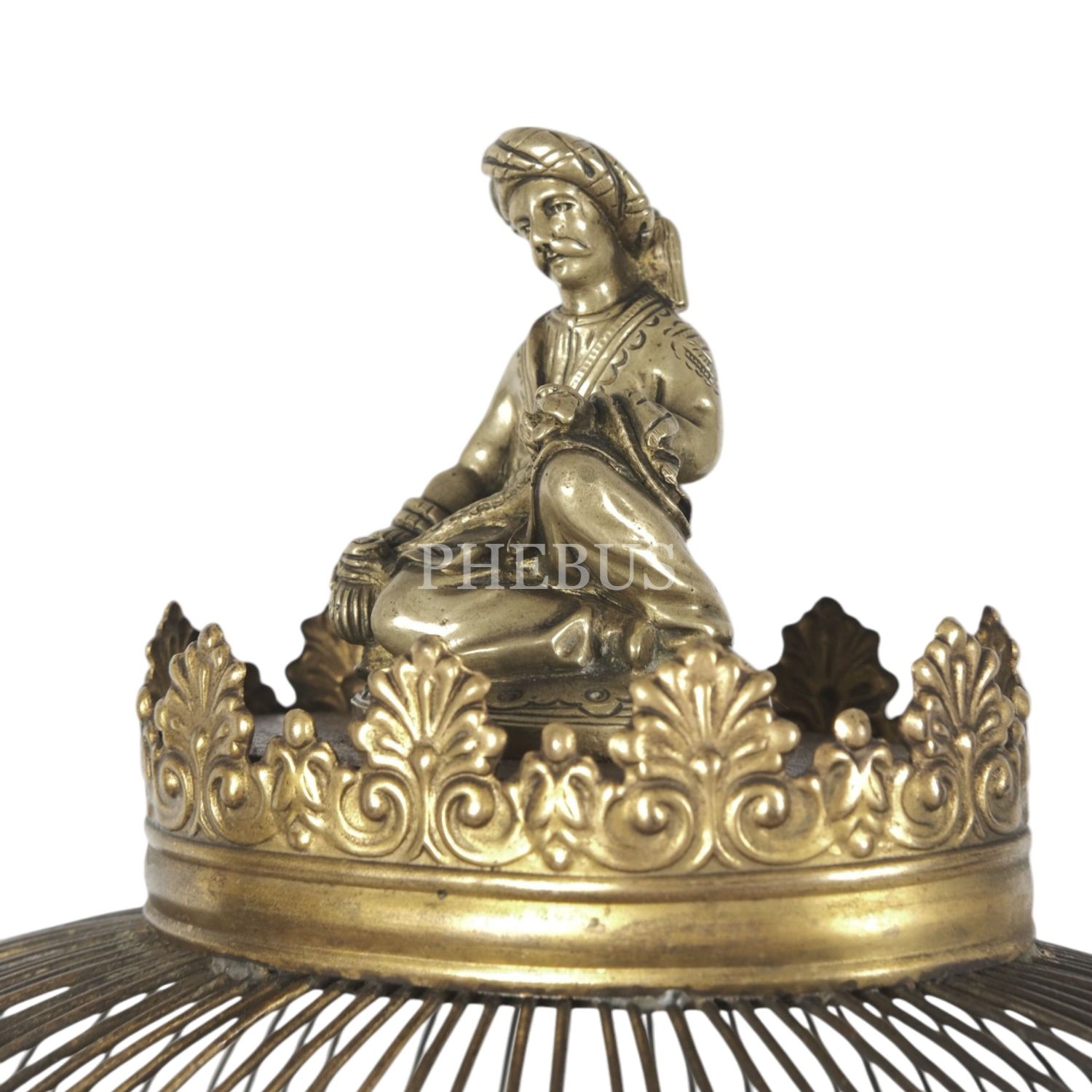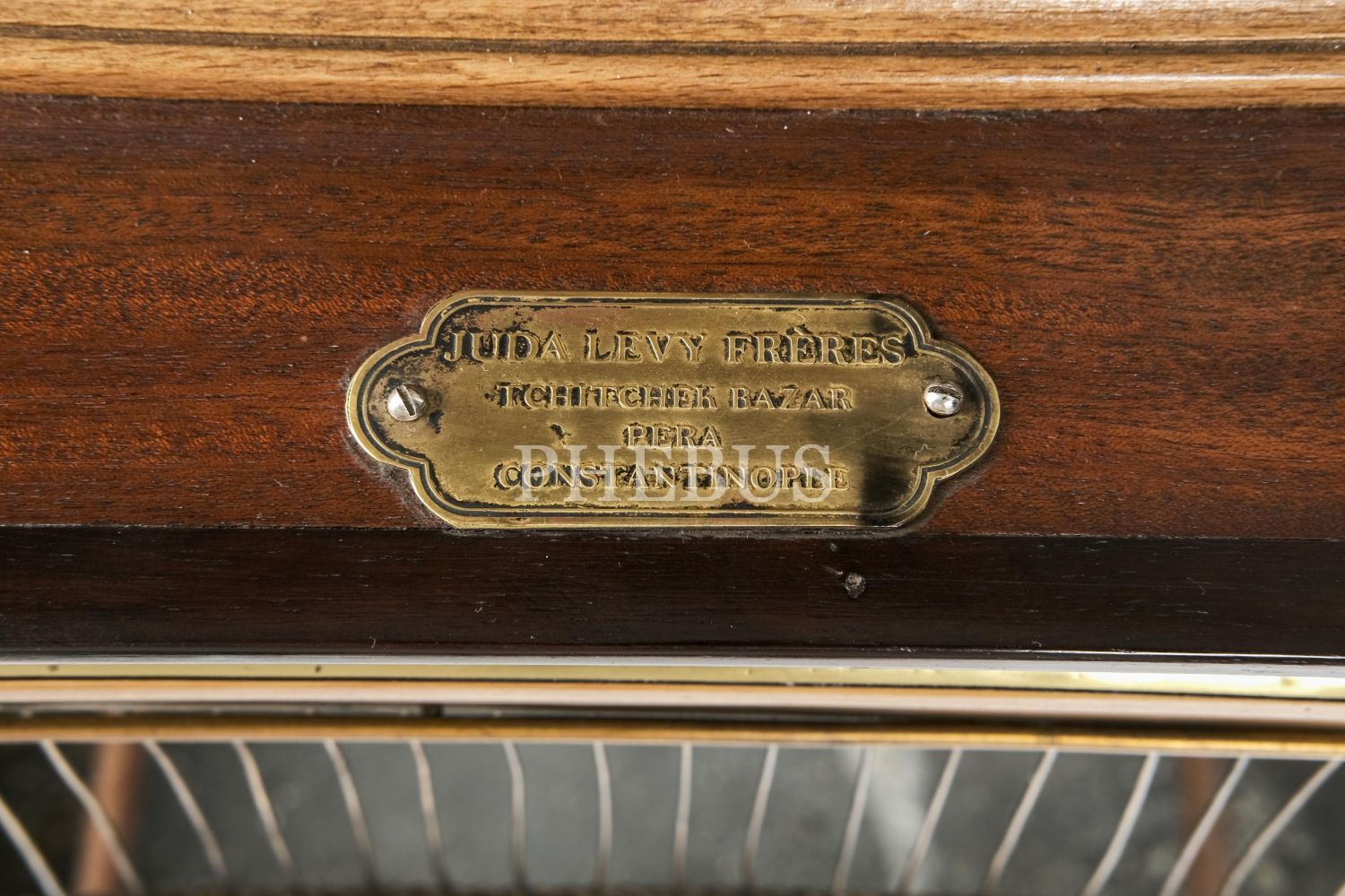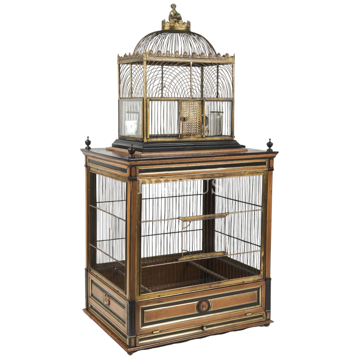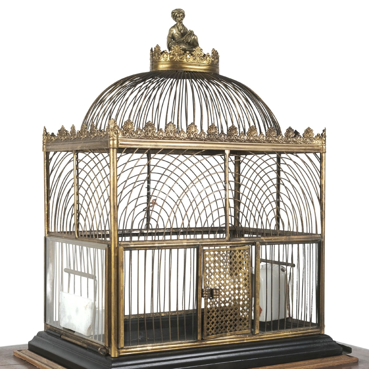 Osmanlı´da Çiçek Pasajı´nda faaliyet gösteren tüccarlar Juda Levy Biraderler´in satışa sunduğu iki katlı, ahşap ve metal işçilikli, yemlik ve suluğu porselen, tepesinde yılan oynatıcısı figürünün yer aldığı kuş kafesi, 100x48x38 cm...