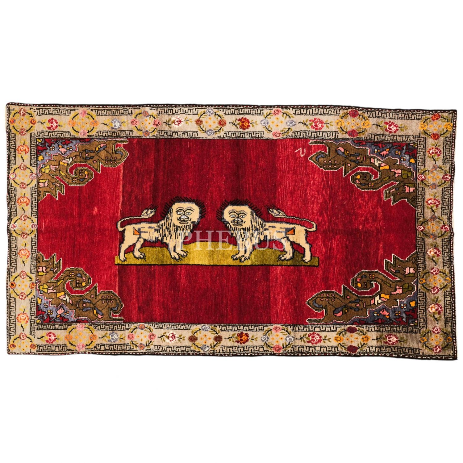 1940´lı yıllarda Orta Anadolu´da dokunmuş çift aslan figürlü halı, 140x250 cm...