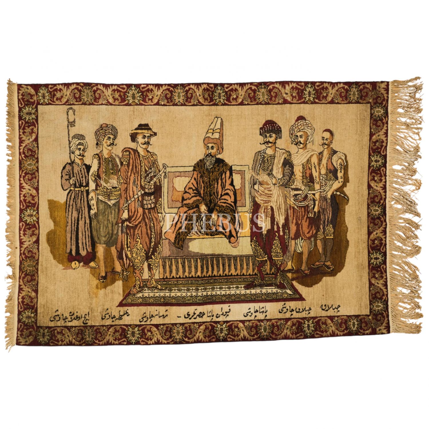1880´lerde dokunmuş, Kaptan Paşa Hazretleri ve Yeniçeri çavuşlarının tasvir edildiği Kumkapı halısı, 135x200 cm...