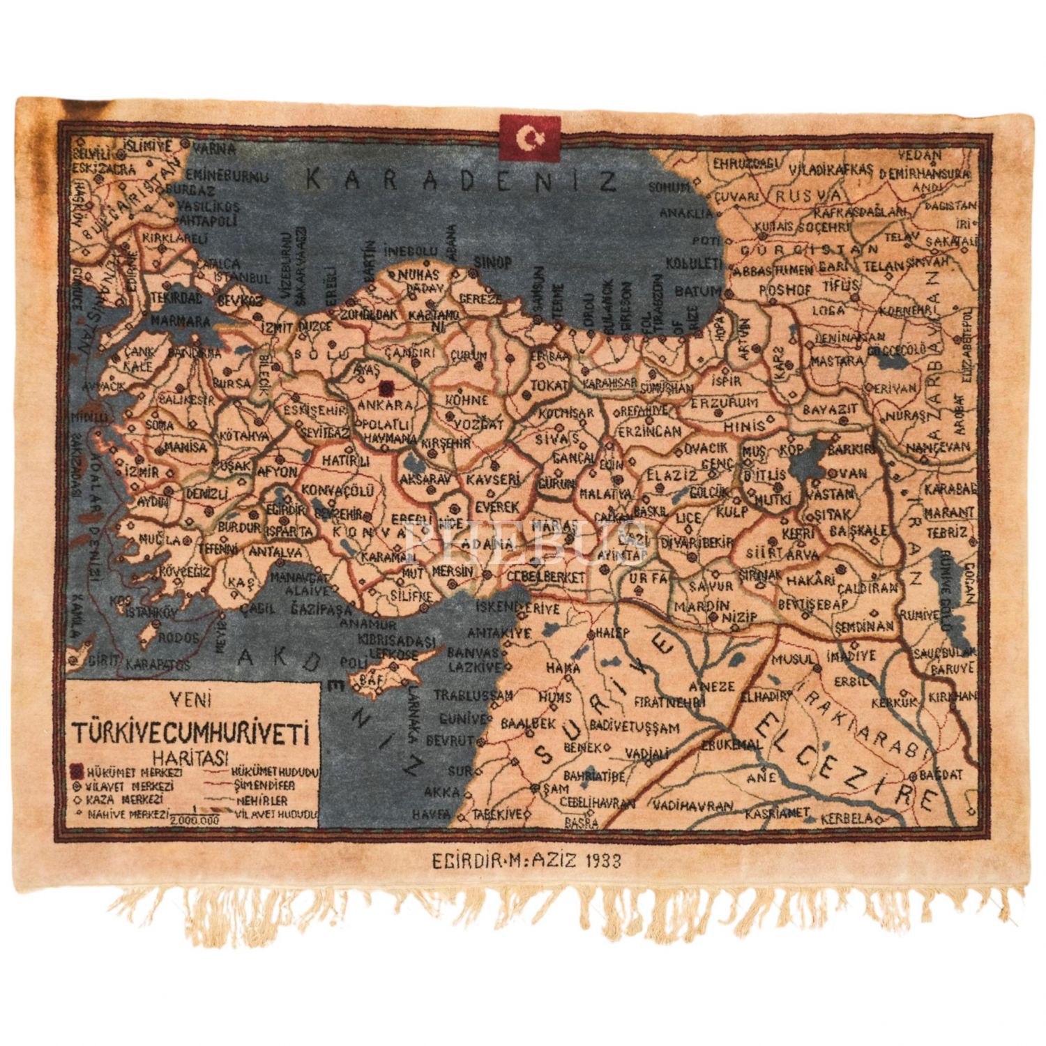 Isparta Eğirdir´de 1930´lu yıllarda dokunmuş,Türkiye Haritası´nın tasvir edildiği halı, 115x150 cm...