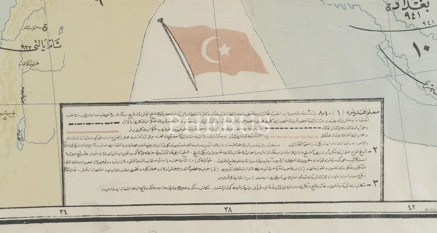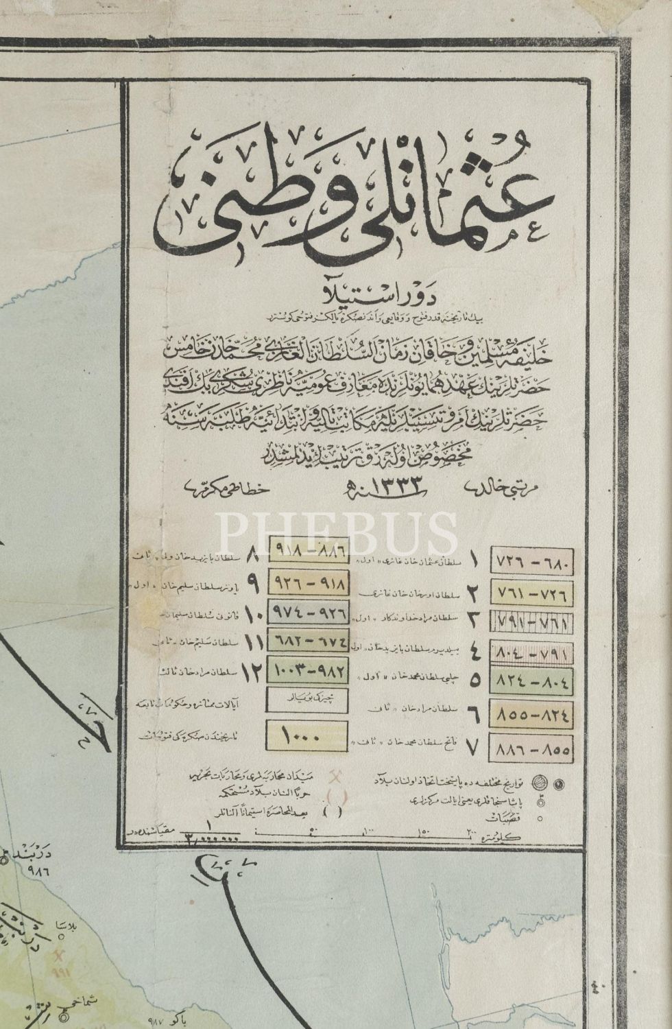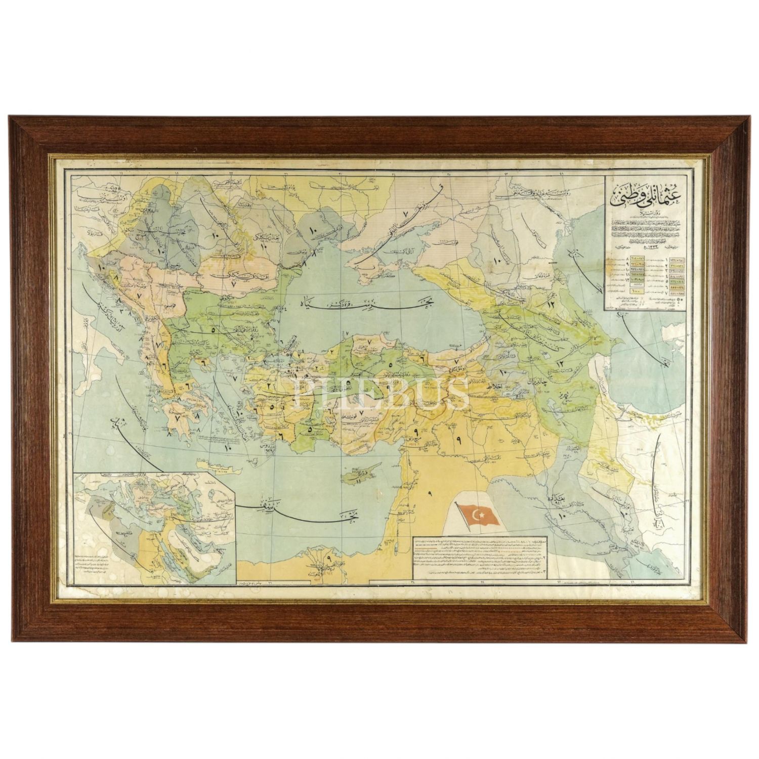 Maarif Nazırı Şükrü Bey tarafından hazırlatılan, Osmanlı Devleti´nin tarihte hüküm sürdüğü toprakların gösterildiği Osmanlı Vatanı başlıklı harita, 1333, çerçeve 130x93 cm, harita 115x78 cm...