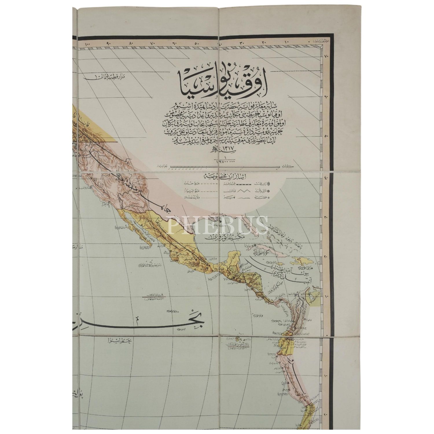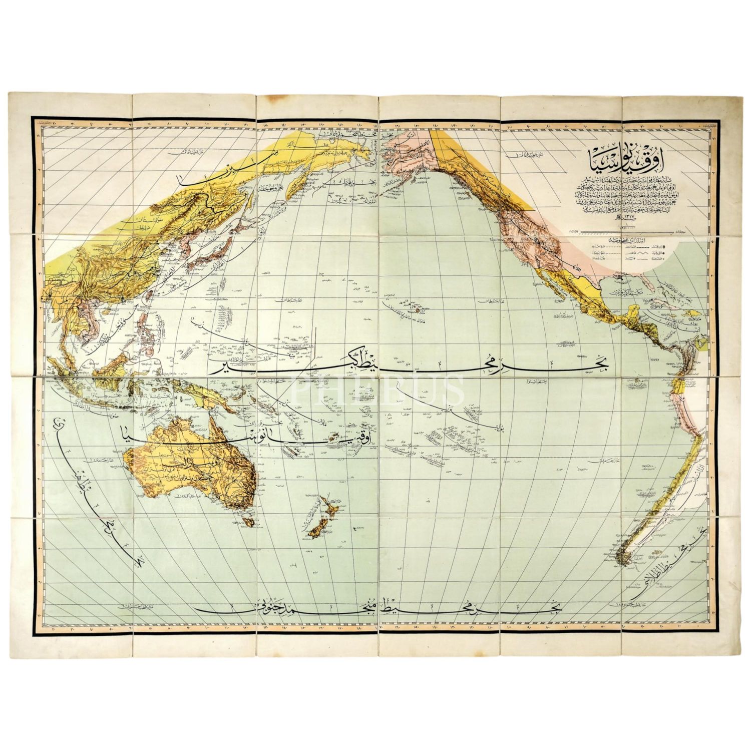 Erkan-ı Harbiye-i Umumiye dairesinde memur Ferik Ali Şeref Paşa tarafından resmedilen Okyanusya haritası, Osmanlı devlet arması ve Ay yıldız desenli orijinal kutusunda, 1318, harita 120x90 cm, kutu 21x24 cm...