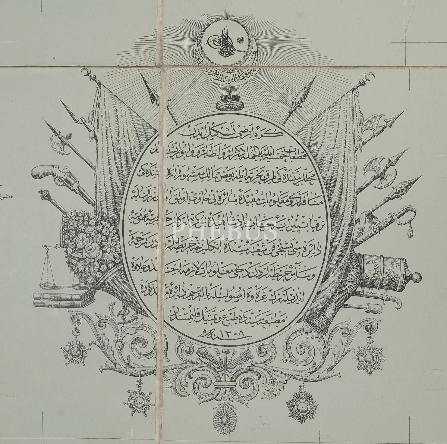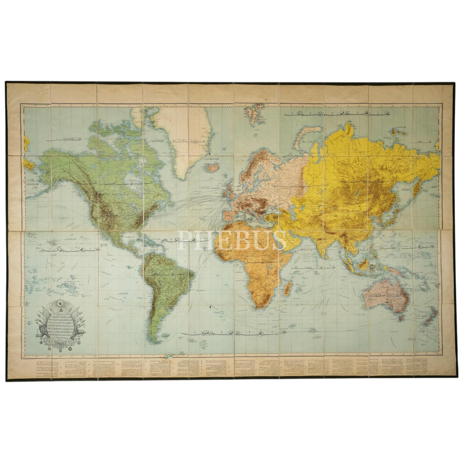 Erkan-ı Harbiye-i Umumiye Dairesi Beşinci Fen Şubesi tarafından İngilizce haritalardan tercüme edilerek hazırlanan Osmanlıca Dünya haritası, Osmanlı devlet arması ve Ay yıldız desenli orijinal kutusunda, 1308, 160x105 cm, kutu 17x27 cm...