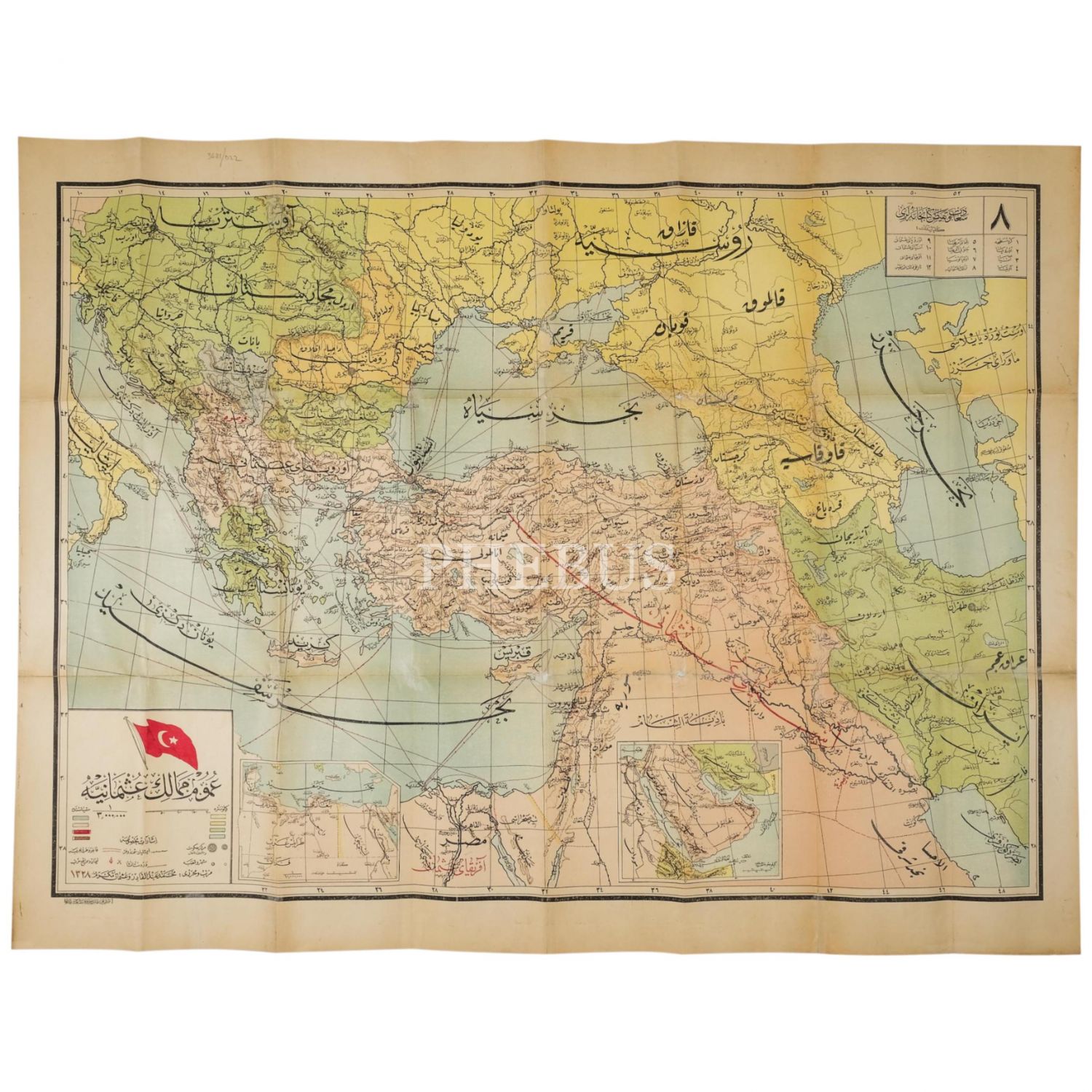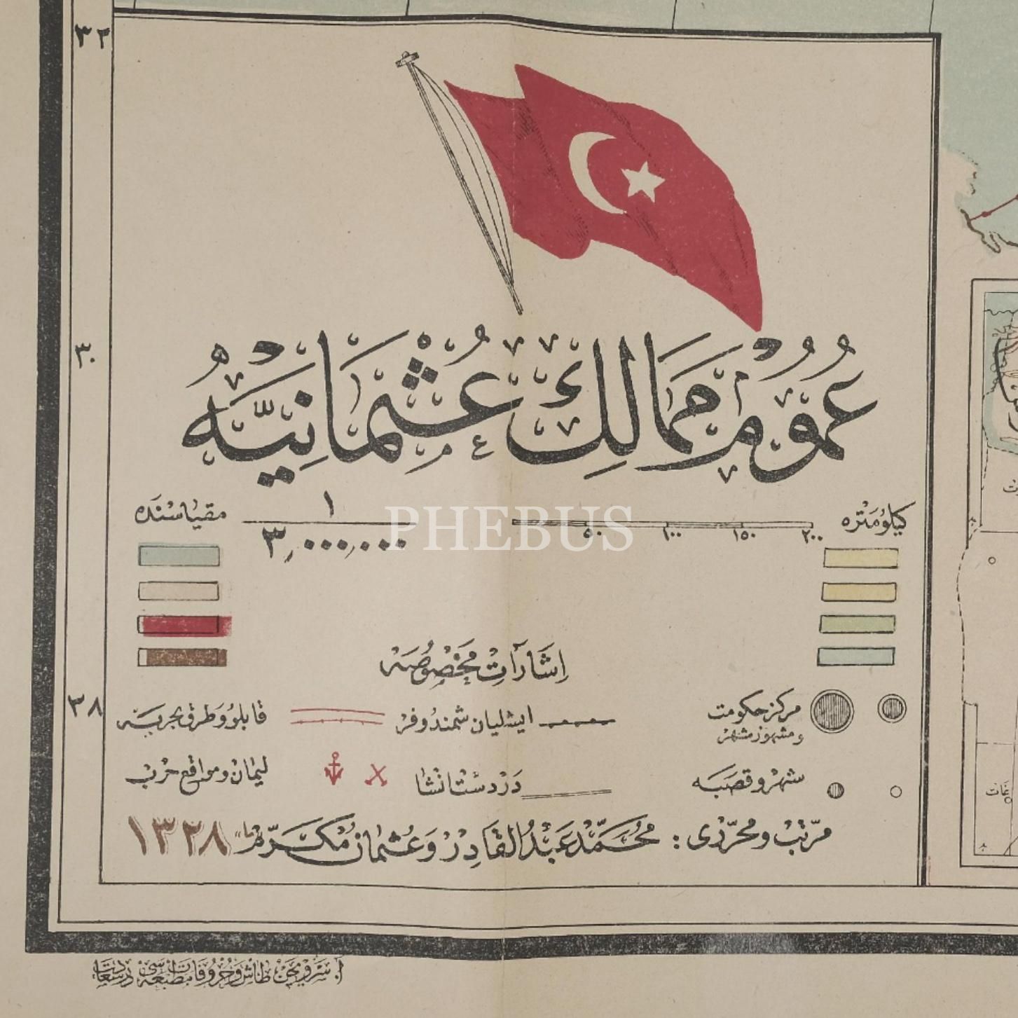"Umum Memalik-i Osmaniye" başlıklı, 1912 yılında Osmanlı Devleti´nin Avrupa, Asya ve Afrika kıtalarında yer alan topraklarının gösterildiği harita (Tertip edenler: Mehmet Abdulkadir - Osman Mükerrem), 1328, A. Saroçin Taş ve Hurufat Matbaası, 125x95 cm...