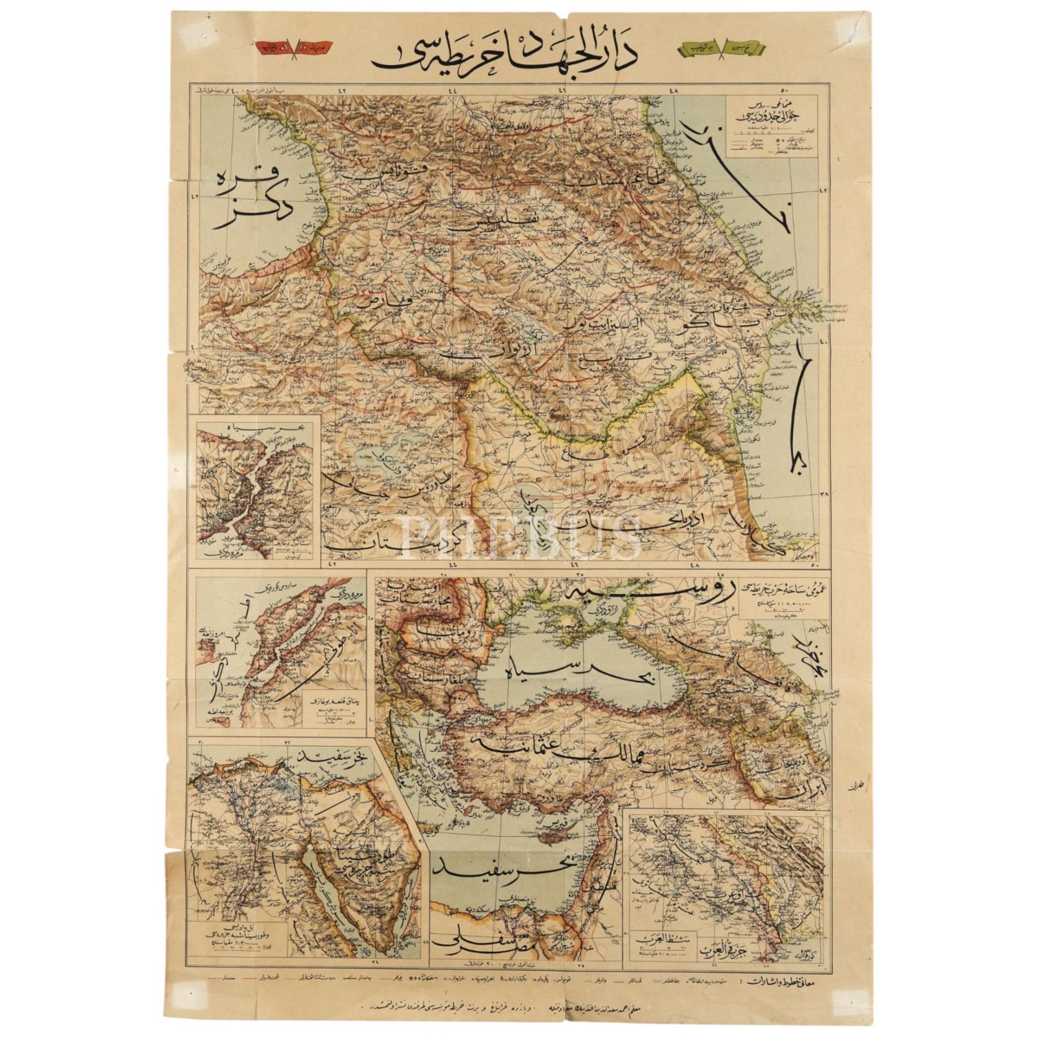 Osmanlı Devleti´nin 1. Dünya Savaşı´nda savaştığı cephelerin gösterildiği "Darü´l Cihad Haritası" başlıklı, Muallim Ahmed Sadettin Efendi marifetiyle Viyana´da bastırılan harita, 51x73 cm...