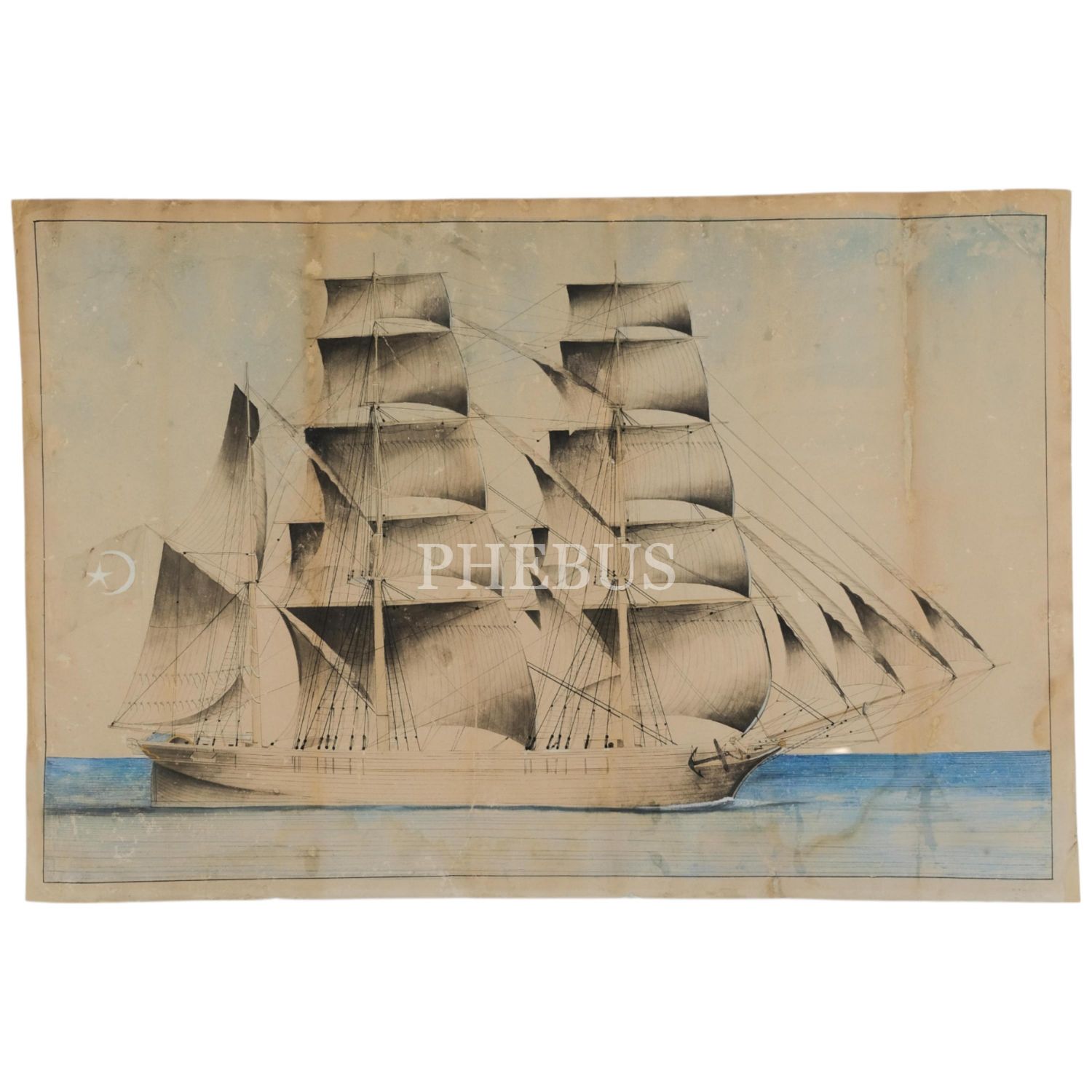 Osmanlı donanmasından bir fırkateynin resmedildiği orijinal çizim, 67x45 cm...