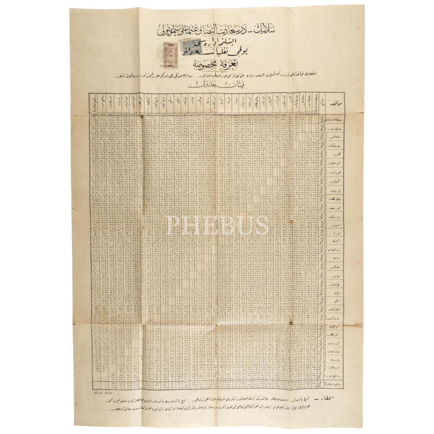"Selanik - Dersaadet İltisak-ı Osmani Demiryolu İşletme İdaresi Yolcu Nakliyesine Dair Tarife-i Mahsusa" başlıklı fiyat tarifesi, 77x54 cm...