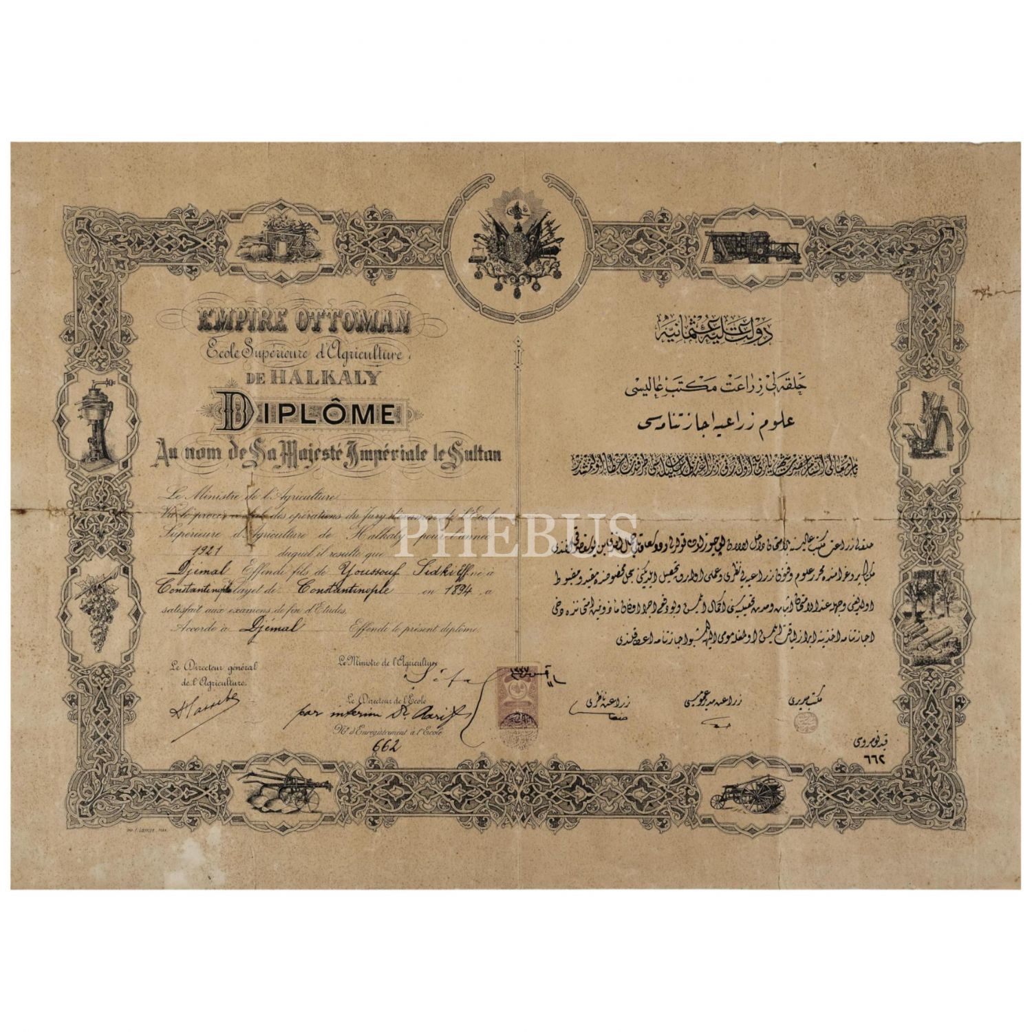 Halkalı Ziraat Mektebi tarafından Osmanlıca ve Fransızca olarak Yusuf Sıdkı Efendi adına düzenlenmiş ulum-u ziraiyye icazetnamesi, 1921, 60x43 cm...