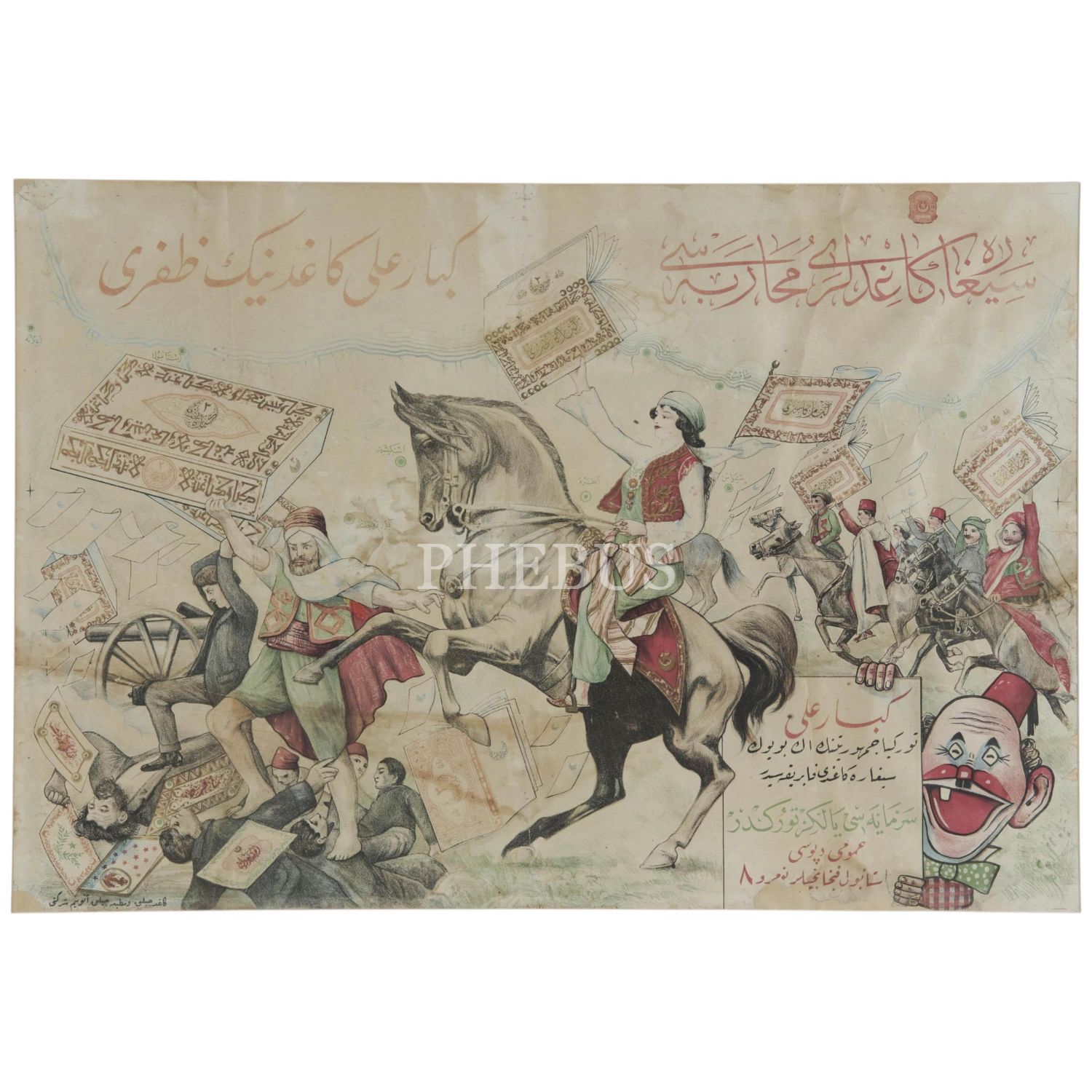 "Sigara Kâğıtları Muharebesi / Kibar Ali kâğıdının Zaferi" başlıklı Osmanlıca reklam afişi, Kâğıtcılık ve Matbaacılık Anonim Şirketi, çerçevesiyle birlikte 89x63 cm...