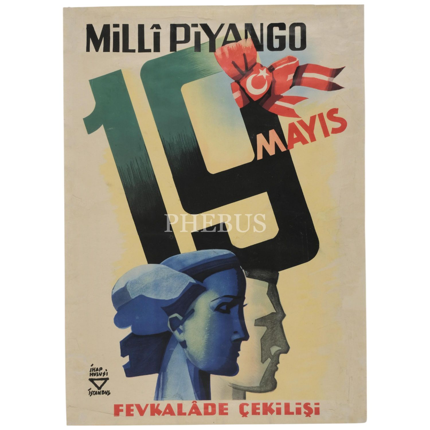 İhap Hulusi tasarımıyla "Millî Piyango 19 Mayıs Fevkalâde Çekilişi" afişi, 50x70 cm...